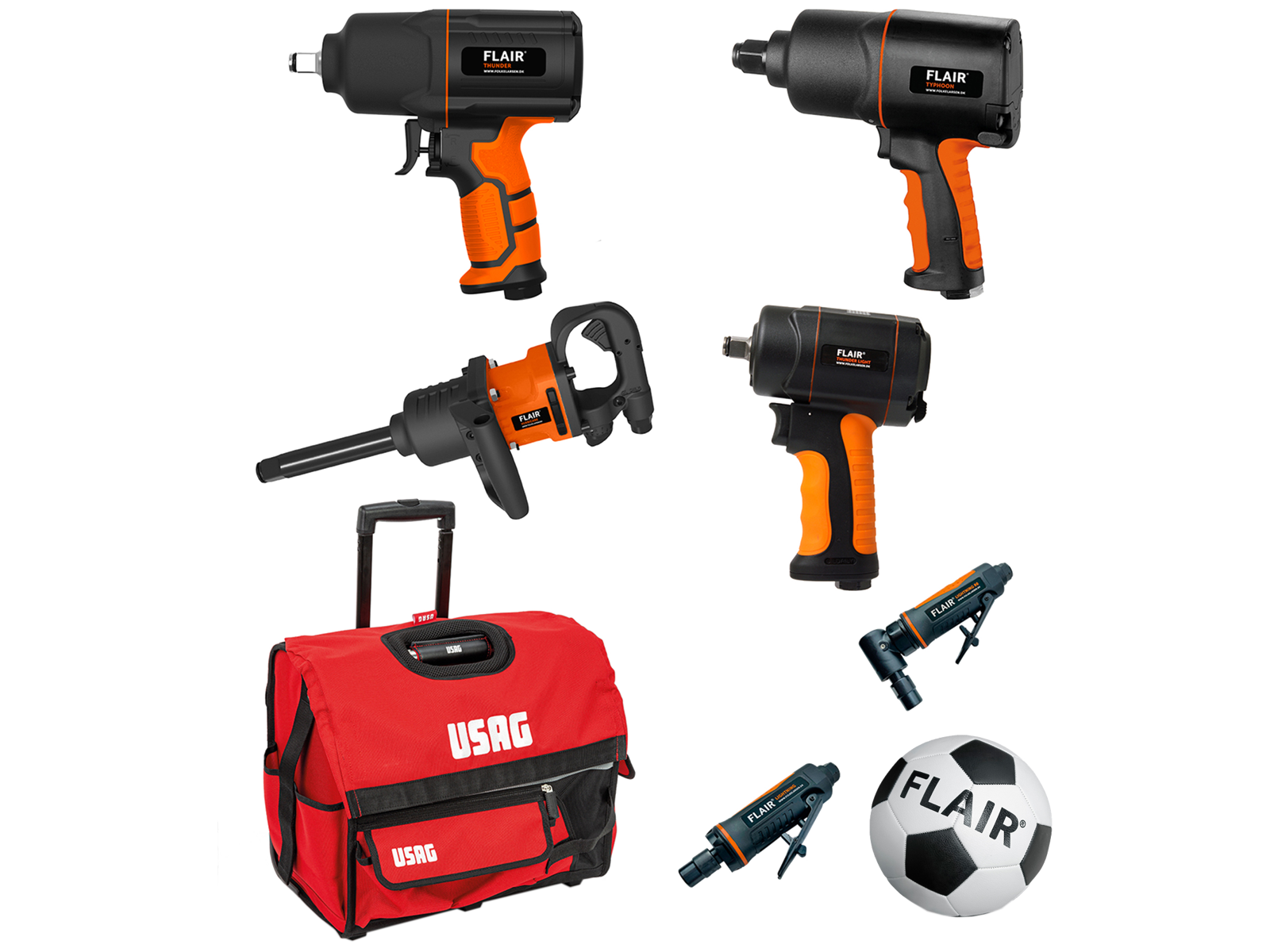 Orange luftværktøjssæt med trolley og fodbold. Flair Thunder 1/2" slagnøgle (tilspænding maks.1.640 Nm, breakaway torque 1.932 Nm), Flair Thunder Light 1/2" slagnøgle (tilspænding maks. 1.000 Nm, breakaway torque 1.170 Nm), Flair Typhoon 3/4" slagnøgle (tilspænding maks. 2.160 Nm, breakaway torque 2.527 Nm), Flair Hurricane 1" slagnøgle (tilspænding maks. 2.568 Nm, breakaway torque 2.527 Nm), Flair Lightning 6 mm lynsliber (25.000 omdr./min.), Flair Lightning 6 mm vinkellynsliber (20.000 omdr./min.), USAG trolley på hjul og en Flair fodbold.