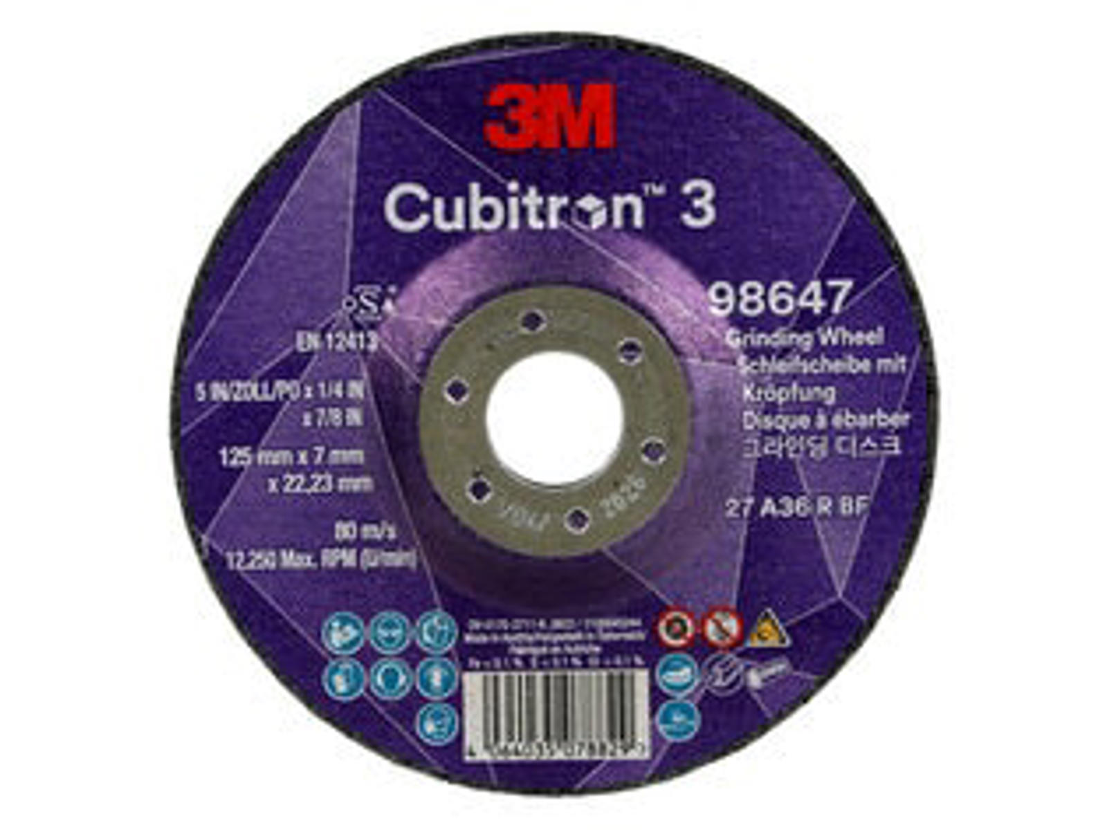 3M Cubitron 3 Skrubskive med forsænket midte er en usædvanligt hurtigskærende og fast slibeskive til fjernelse af grove svejsninger og andre krævende slibeopgaver. Ved hjælp af en forsænket midte, der gør det muligt at slibe i enhver vinkel, fungerer denne skive godt på næsten alle materialer, mens den er specielt udviklet til rustfrit stål, blødt stål og legeringer til luft- og rumfart. Derudover er 3M Cubitron 3 Skrubskive med forsænket midte drevet af 3M Forbedrede præcisionsformede slibekorn ved hjælp af patenterede gennembrud inden for molekylær bindingsteknologi designet med skarpe, kantede strukturer, der kontinuerligt spaltes for at danne skarpe kanter. Disse rene, skarpe spidser er med til at skabe et slibeprodukt, der skærer hurtigere, er mere køligt og holder meget længere end almindelige slibemidler.