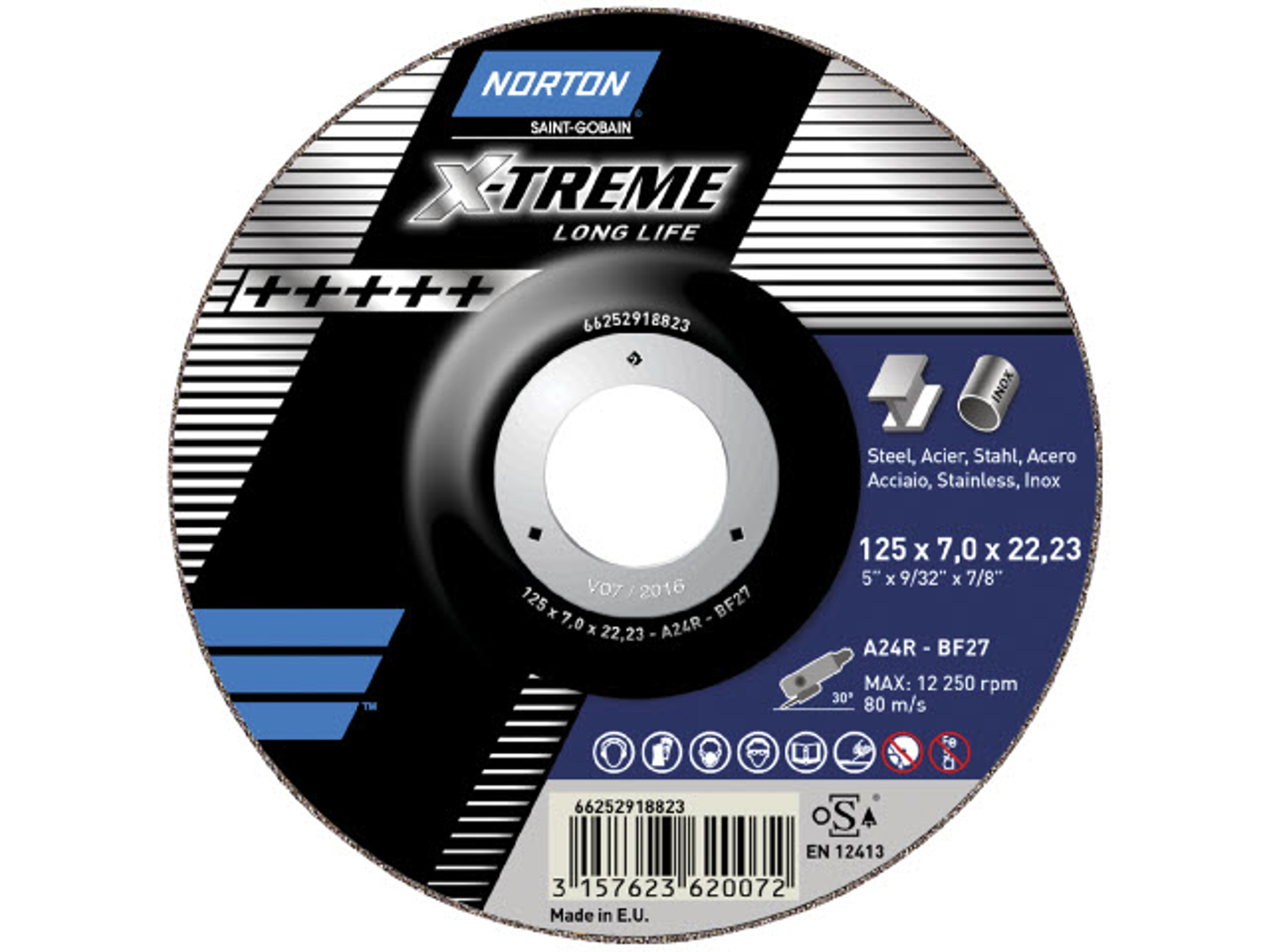 X-Treme. Til slibning af jern, stål og rustfrit. Jernfri, dvs. med et meget lavt indhold af jern, klor og svovl. Armerede. Maks. periferihastighed 80 m/s.