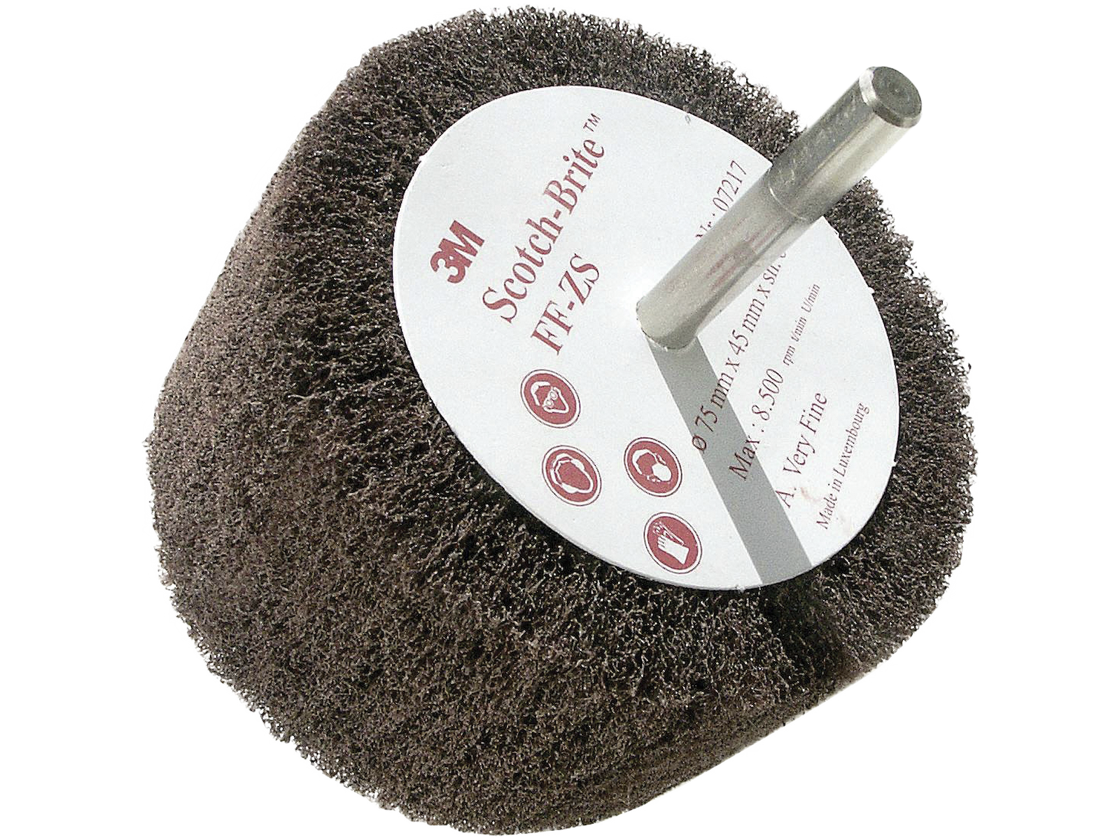 3M Scotch-Brite skaftmonteret flapbørste FF-ZS. Flapbørsten har et jævnt, mat ridsemønster, hvilket giver en ensartet overflade uden slidmærker. FF-ZS er beregnet til polering og rengøring og producerer en finere overflade end kombinerede flapbørster.
