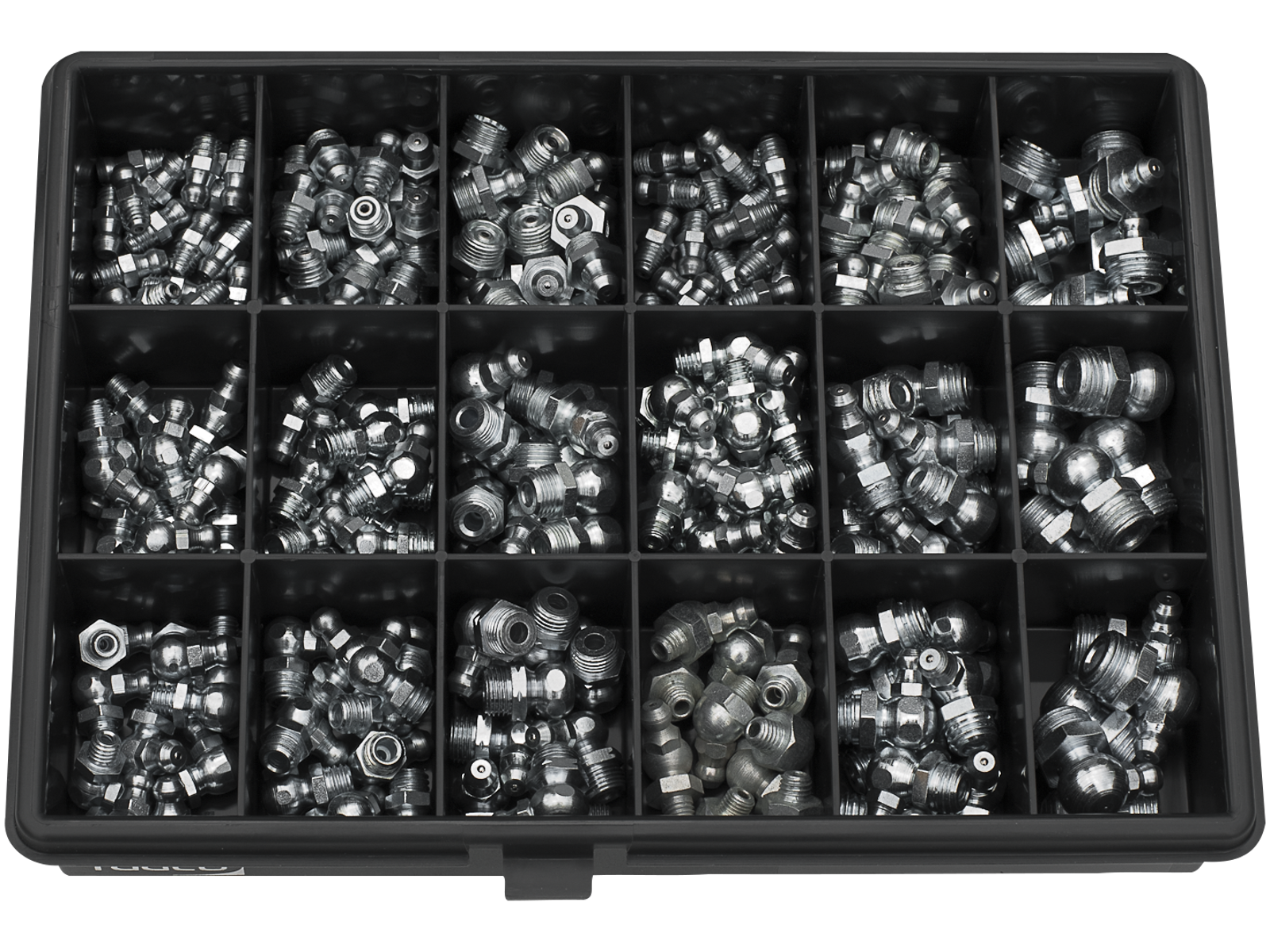 Tryksmørenipler i sortiments-boks 240 stk. tryksmørenipler af elgalvaniseret stål fordelt på 18 rum. Indeholder H1, H2 og H3 med gevind typerne: H1. M6x1.0, M8x1.0, M10x1.5, 1/8"R, 1/4"R & 1/4"SAE. H2. M6x1.0, M8x1.25, M10x1.5, 1/8"R, 1/4"R & 1/4"WW H3. M6x1.0, M8x1.25, M10x1.5, 1/8"R, 1/4"R & 1/4"BSF