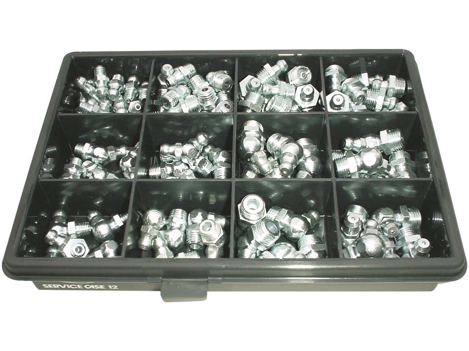 Tryksmørenipler i sortiments-boks 120 stk. tryksmørenipler af el galvaniseret stål fordelt på 12 rum. Indeholder H1, H2 og H3 med gevind typerne: H1: M6x1.0 - M8x1.0 - M10x1.0 & 1/8"R. H2: M6x1.0 - M8x1.0 - M10x1.0 & 1/8"R. H3: M6x1.0 - M8x1.0 - M10x1.0 & 1/8"R.