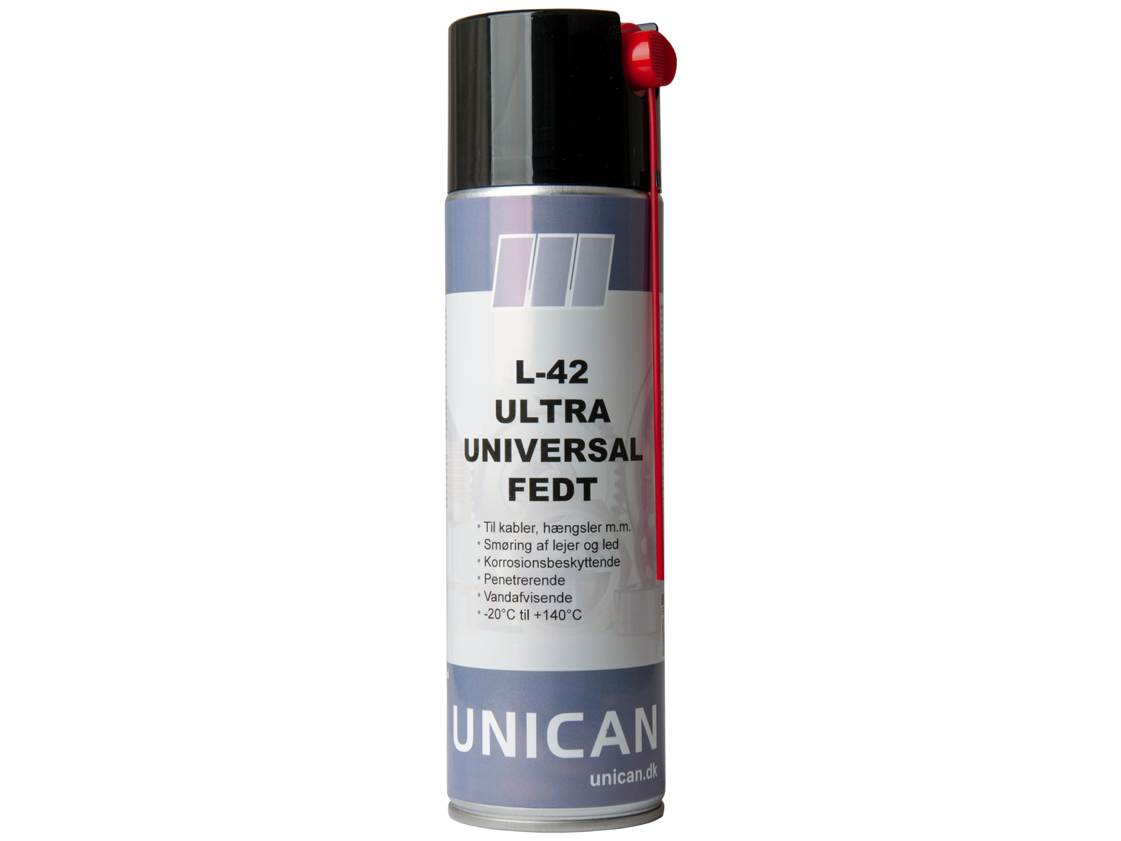 L-42 Ultra universalfedt er ideel til smøring af utilgængelige steder som: kabler, fjedre, hængsler, føringer osv. Fedtet bruges også til at smøre lejer og led. Driftstemperatur: ÷20°C til 140°C (kort varigt 150°C). Meget vandafvisende både overfor varmt og koldt vand og høj modstandsdygtighed overfor syrer og baser. Stærkt penetrerende. Danner en smørefilm, som er slidstærk og giver langvarig beskyttelse mod rust og korrosion. Dobbelt kugleventil til anvendelse i alle positioner. Leveres med 2 typer dyser: En med kort og en med langt rør (100 mm).