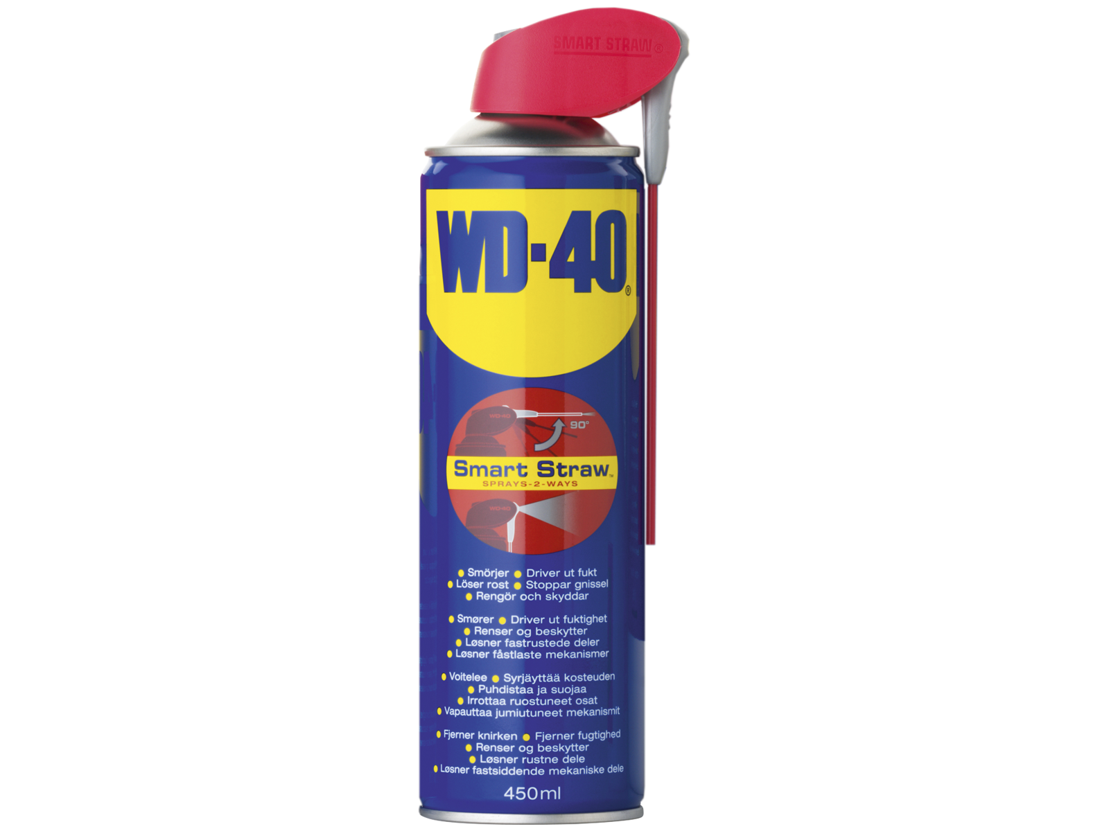 WD-40 Smart-Straw sprøjter dobbelt så godt, takket være det nye klapsystem på sprøjtehovedet. Til punktnøjagtig sprøjtning f.eks. ved brug som kontaktspray eller ved vedligeholdelse af låsecylindre, klapper man bare røret ud i en vinkel på 90°. Til fladedækkende sprøjt, f.eks. ved fælgrensning eller pleje af haveværktøjer, klappes røret ganske enkelt ned igen. Med den nye WD-40 Smart Straw er det slut med at lede efter røret og man kan betjene klapfunktionen med en enkelt håndbevægelse.