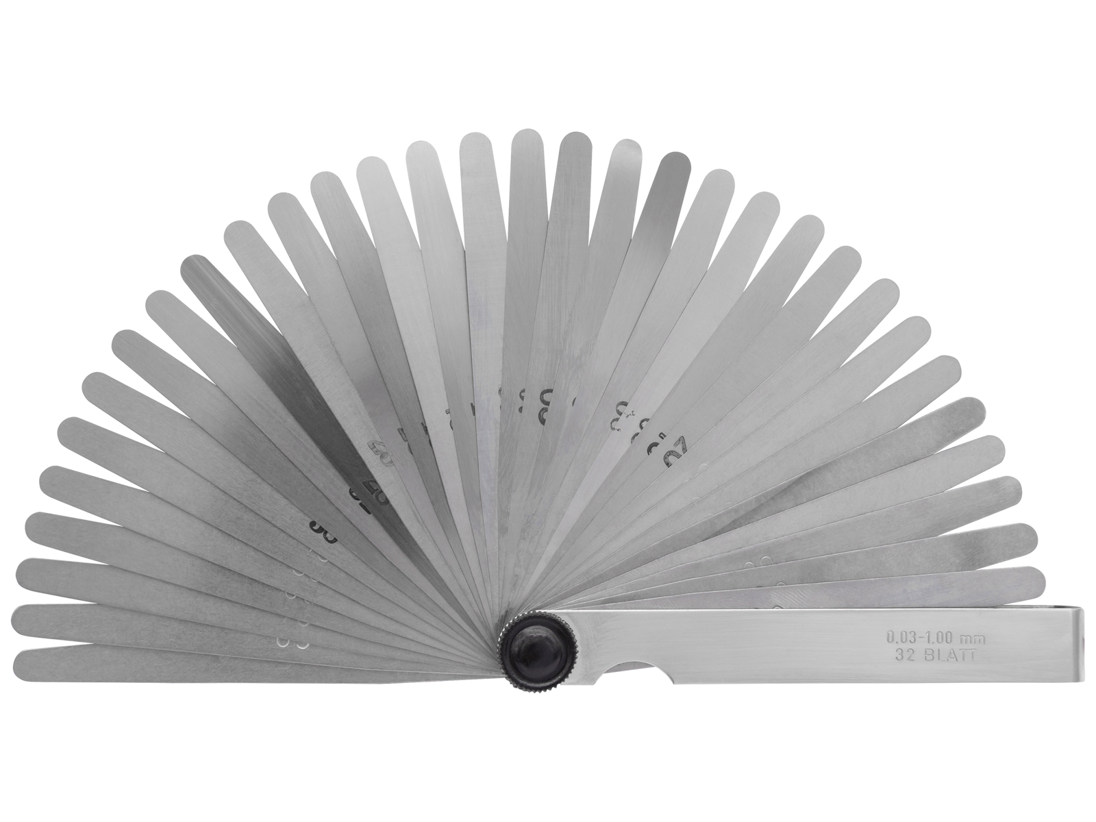 Søgerblade i sæt. Fjederkonstante stålblade i konisk form med påskrift af tykkelse. Forniklet holder med nittet led som kan spændes. DIN 2275. Nøjagtighed efter klasse T2. 32 blade i tykkelserne 0,03-1,00 mm: 0,03 - 0,04 - 0,05 - 0,06 - 0,07 - 0,08 - 0,09 - 0,10 - 0,12 - 0,15 - 0,18 - 0,20 - 0,23 - 0,25 - 0,28 - 0,30 - 0,32 - 0,35 - 0,38 - 0,40 - 0,45 - 0,50 - 0,55 - 0,60 - 0,65 - 0,70 - 0,75 - 0,80 - 0,85 - 0,90 - 0,95 - 1,00 mm.