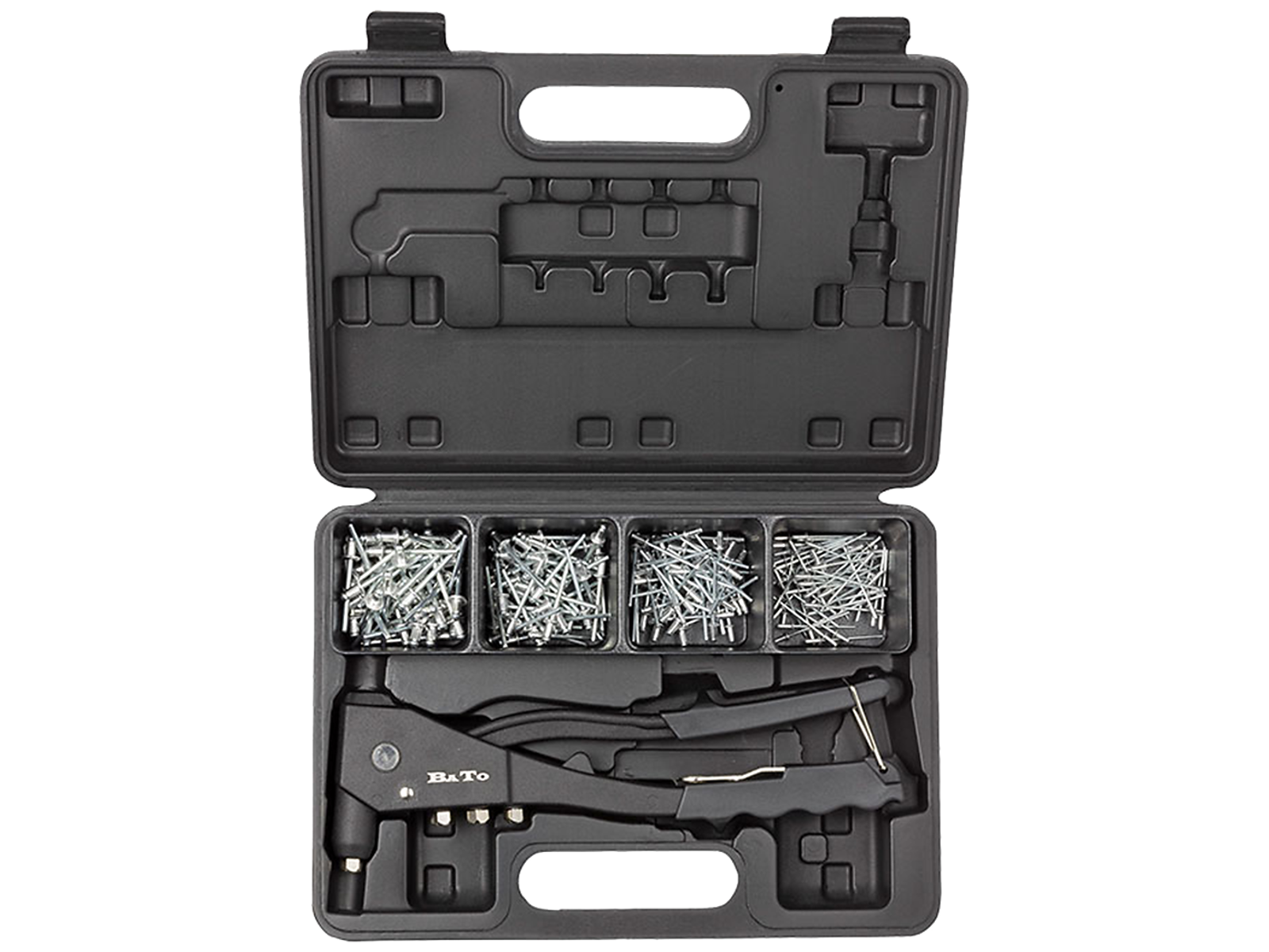 Blindnitte-montør sæt med håndnittetang med kapacitet 2,4 til 4,8 mm (rustfri 2,4 til 4,0 mm) og fire slags nitter. Leveres i kraftig plastkuffert.