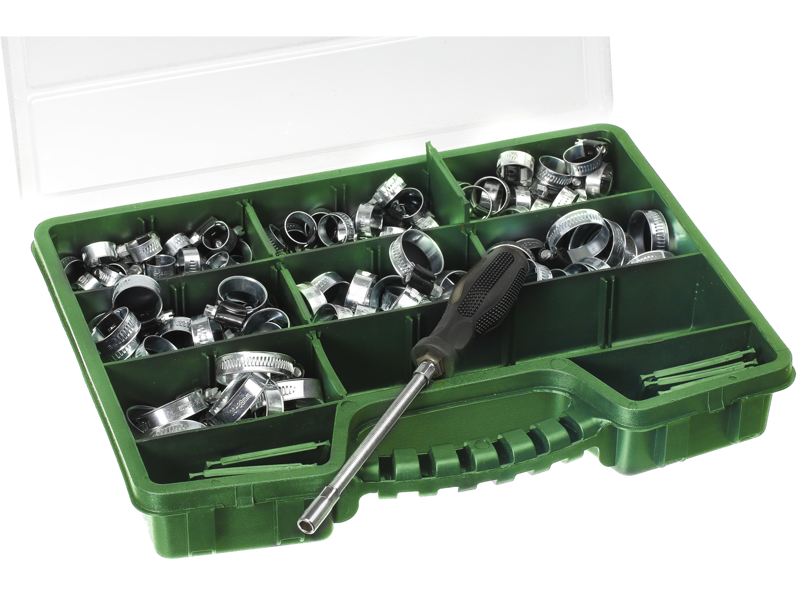 Spændebåndssortiment med 135 stk. assorterede spændebånd 8-38 mm og fleksibel skruetrækker. Vælg mellem galvaniseret eller syrefast.