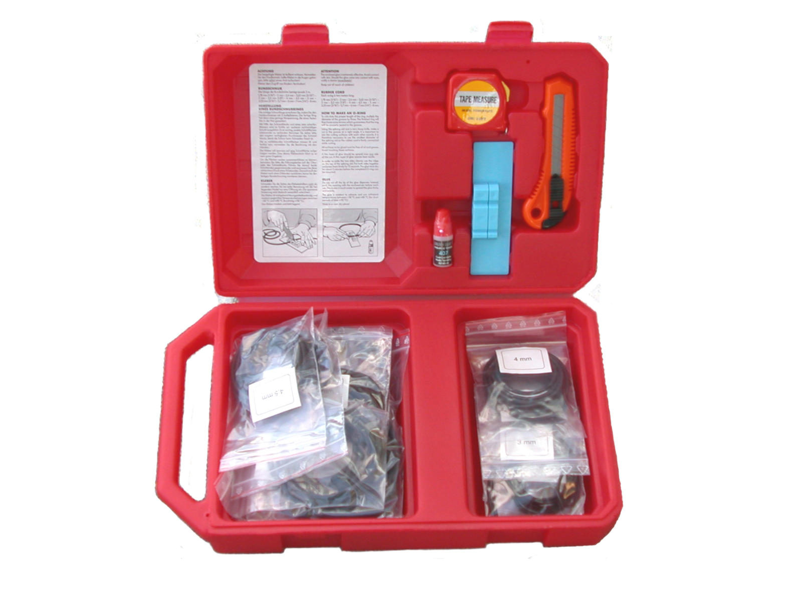 Oringssnor i længder af 2 mtr. + sekundlim, kniv, skæreindretning og målebånd