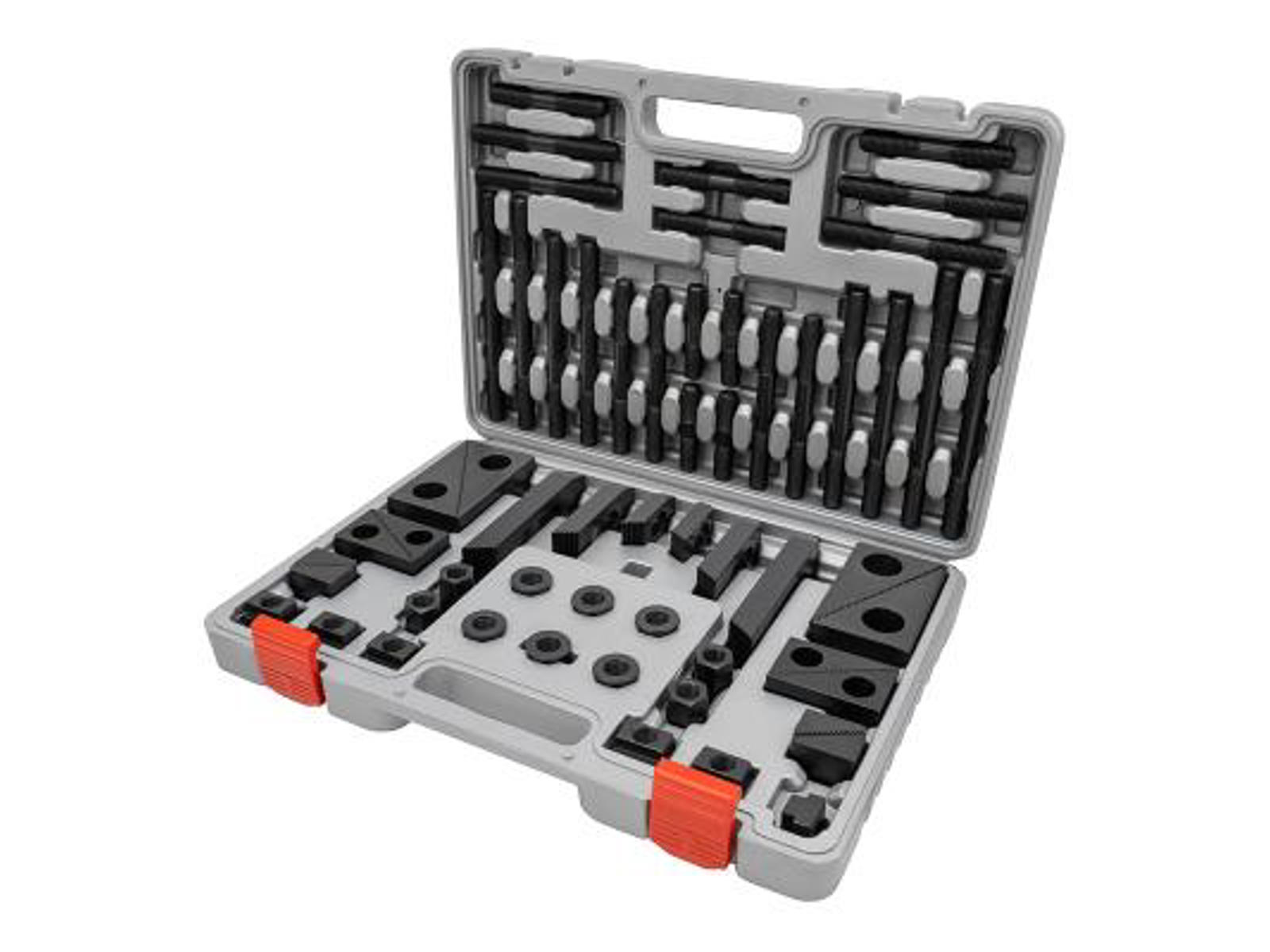 Spændesæt 58 dele. Alle spændestykker er hærdede, trappeklodser er fremstillet i sintret stål og alle dele er sort oxideret. Indeholder: 24 pinbolte, 4 stk. af hver 75-100-125-150-175-200 mm, 6 T-not møtrikker, 6 bundmøtrikker, 4 forlængermøtrikker, 12 spændeunderlag (6 par), 6 spændejern (3 par): 100-150-200 mm. Leveres i praktisk plastkasse.