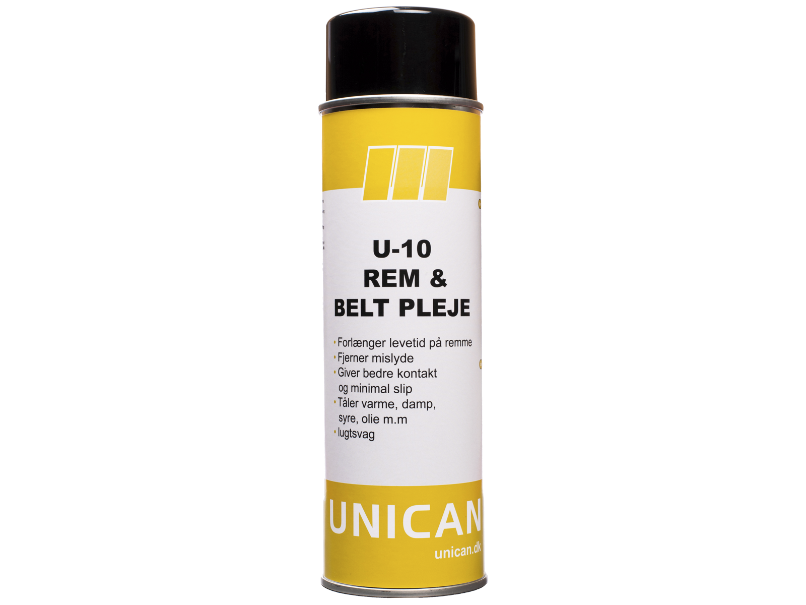 U-10 Rem og Belt Pleje kan med betydelig effekt anvendes til smøring/impregnering af langt de fleste typer kileremme og med en lang række fordele til følge. Ved påførelse sprayes begge sider af remmen, hvorved kontakten til remskiverne øges. Dette bevirker at slip-problemer minimeres og samtidig fjerner U-10 Rem og Belt Pleje mislyde fra remmene. Produktet mindsker desuden også risikoen for revnede/flossede remme og øger derfor remmenes levetid betragteligt. U-10 Rem og Belt Pleje påføres i en afstand af 25-30 cm. Lad produktet tørre ca. 1 minut.