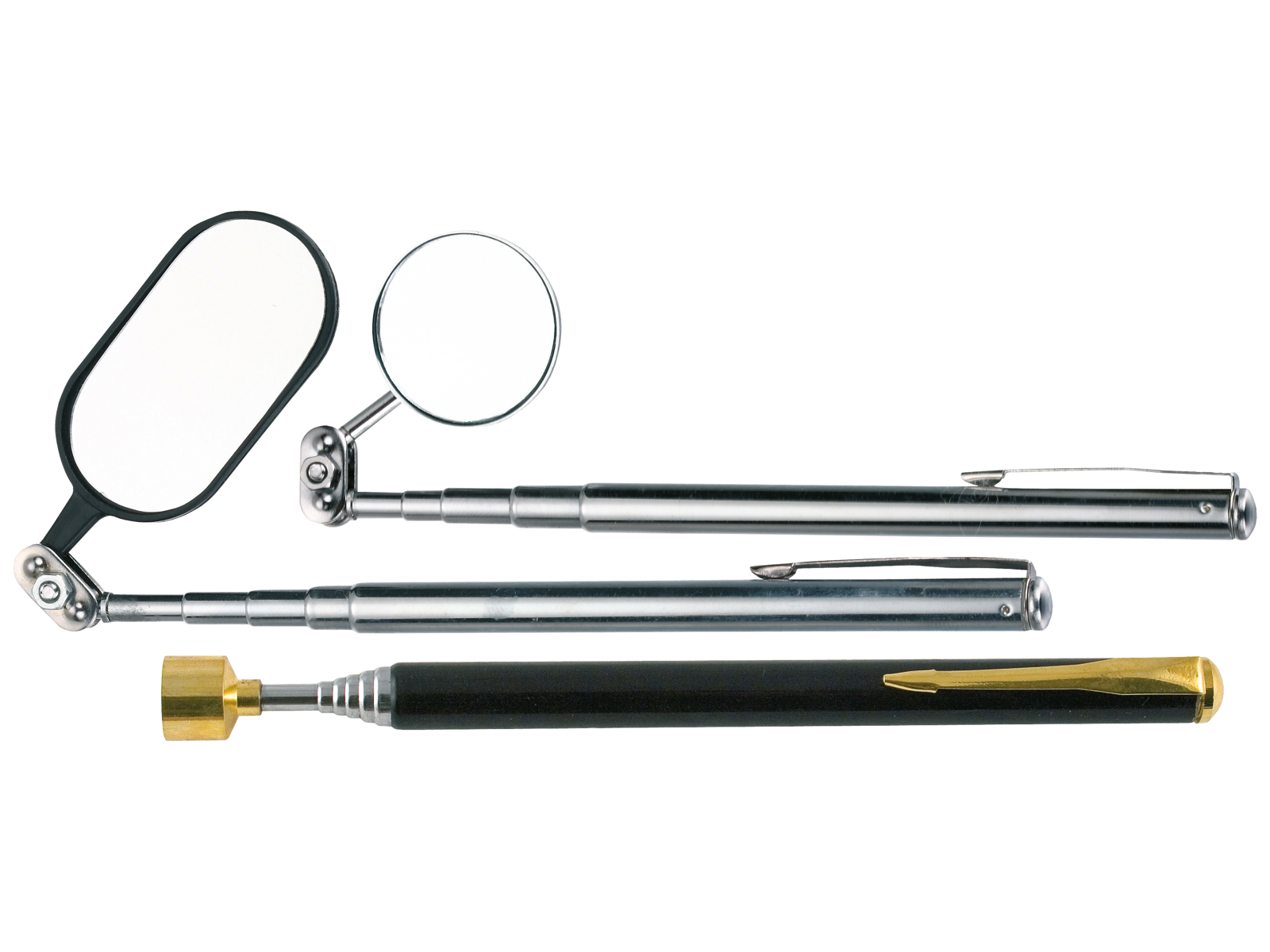 Teleskopsæt med to inspektionsspejle hhv. rundt og elipseformet, med teleskopskaft med lommeclips, samt en kraftfuld magnet til opsamling af magnetiske genstande som fx bolte og møtrikker - ligeledes med lommeclips.