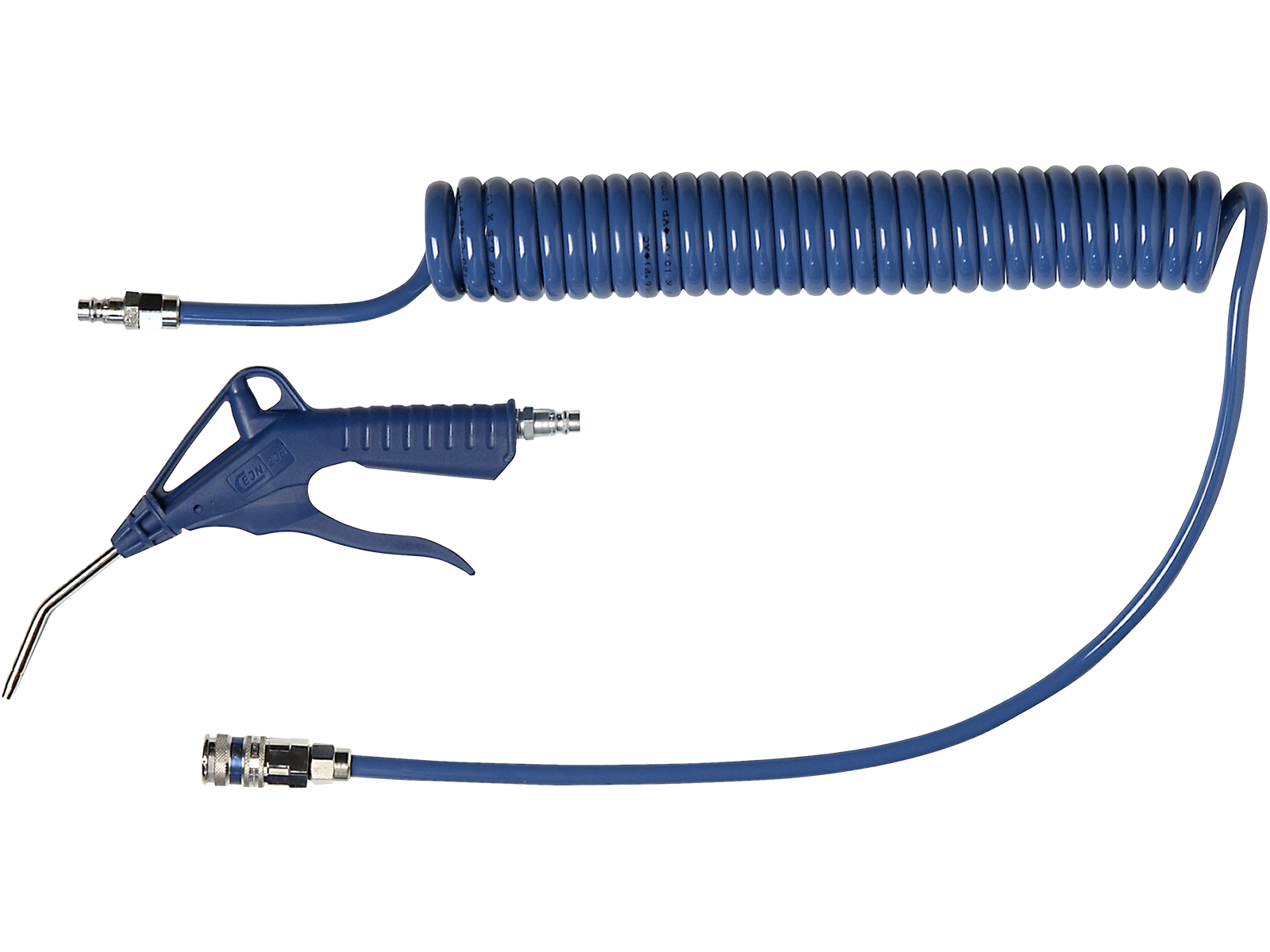 • Spiralslangesæt til trykluft - formonteret og klar til brug. Let og fleksibel spiralslange med 320 eSafe-kobling og 320-nippel, samt 208 standard-blæsepistol med fast rør og monteret nippel. Indholdet er genbrugeligt, lufttæt og kræver ingen efterspænding.