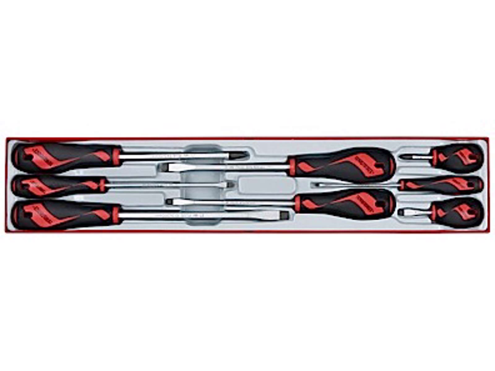 Sæt med 8 skruetrækkere, heraf 2 Stubby-skruetrækkere, til lige kærv og Phillips-kærv. Klinge af TT-MV-PLUS-stål. Ergonomiske tokomponente håndtag med ophængningshul.