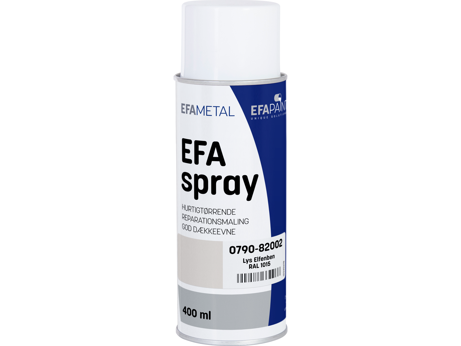 Reparationsmaling til overfladebehandling af stål efter grunding. Spraymaling på basis af alkyd og med propan/butan som drivmiddel. Efaspray er hurtigtørrende og velegnetåtil reparation af mindre områder. Fås i flere farver.