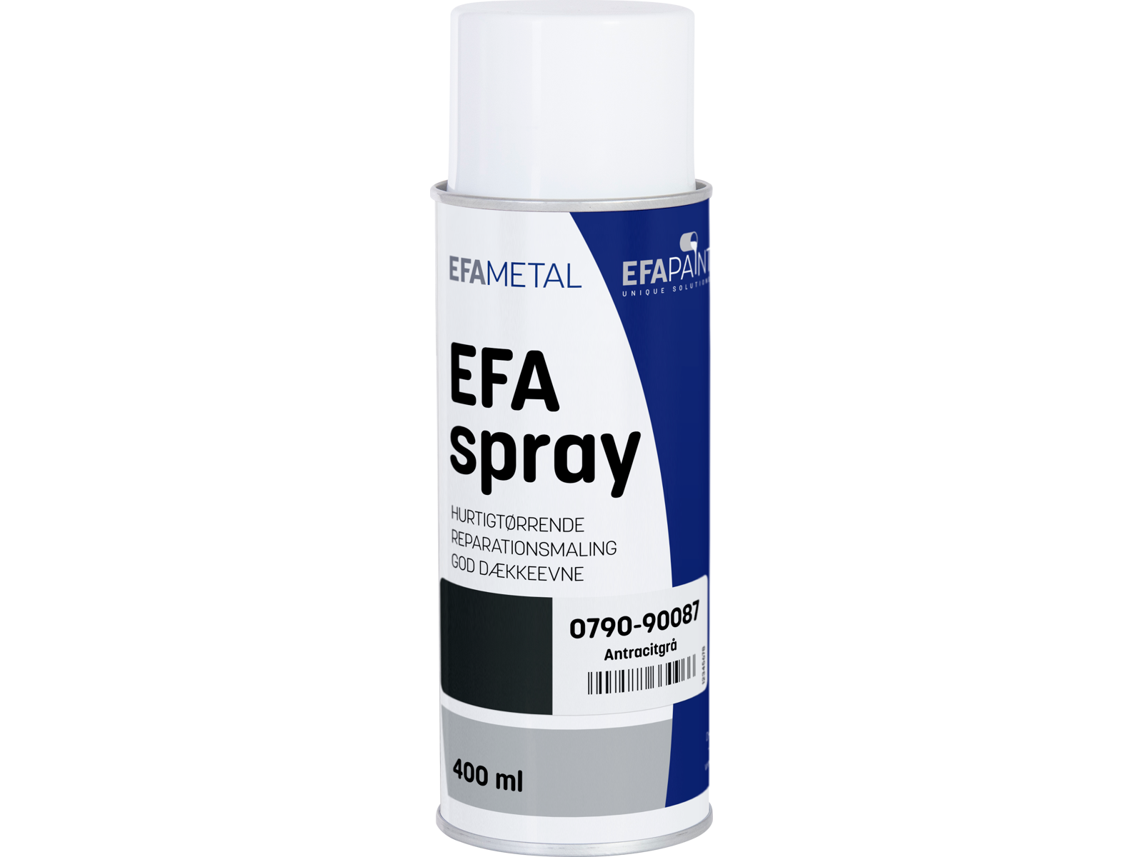 Reparationsmaling til overfladebehandling af stål efter grunding. Spraymaling på basis af alkyd og med propan/butan som drivmiddel. Efaspray er hurtigtørrende og velegnetåtil reparation af mindre områder. Fås i flere farver.