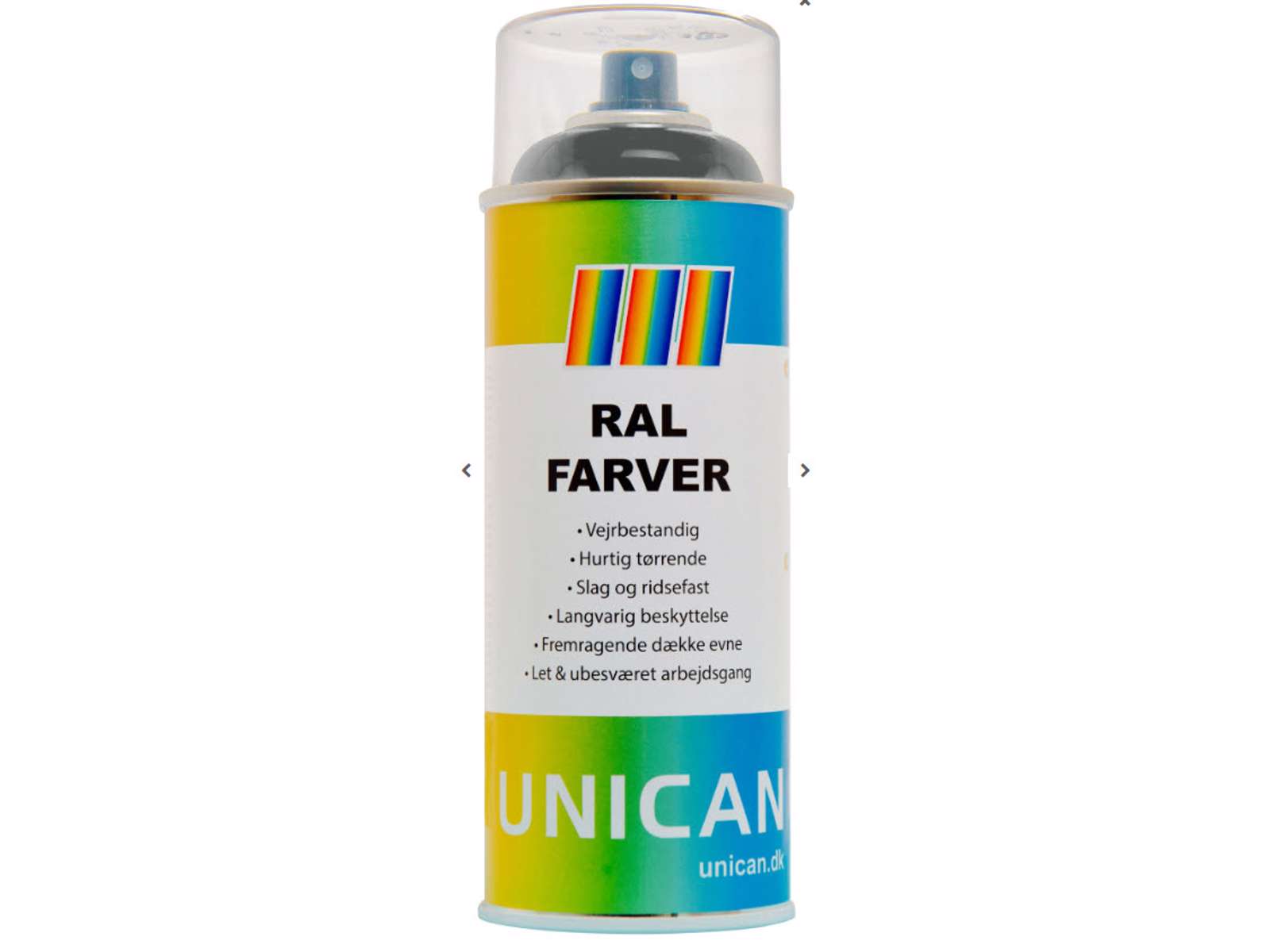 • Vejrbestandig, hurtigtørrende RAL-farve spraymaling med særdeles god dækkeevne samt slag- og ridsefaste egenskaber for en langvarig beskyttelse. RAL-farve er yderst velegnet til at give en flot og beskyttende finish på alle former for maskiner, konstruktioner og andet udstyr. RAL-farven kan også bruges som opmærkningsspray på værktøj eller andet, som ønskes markeret. For bedste resultat anvendes Unican P-55 Grå Primer inden påførelse af RAL-farven. Rengør overfladen for fedt og snavs, ryst dåsen omhyggeligt og påfør RALfarven i en afstand af 25-30 cm. Hvis tykkere lag ønskes, kan nyt lag påføres efter ca. 5 minutter. Produktet kan anvendes udendørs eller i et tilstrækkeligt gennemluftet område. Det optimale resultat opnås ved en temperatur mellem 10-25°C og en fugtighedsgrad, der ikke er for høj - helst under 60 %. Rens dysen efter brug ved at spraye 2-3 sekunder med dåsen vendt på hovedet. Fås i flere farver.