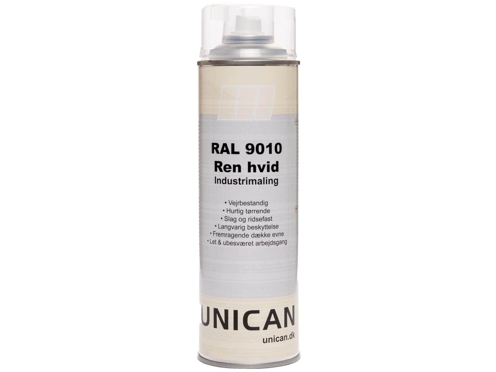 Vejrbestandig, hurtigtørrende RAL-farve spraymaling med særdeles god dækkeevne samt slag- og ridsefaste egenskaber for en langvarig beskyttelse. RAL-farve er yderst velegnet til at give en flot og beskyttende finish på alle former for maskiner, konstruktioner og andet udstyr. RAL-farven kan også bruges som opmærkningsspray på værktøj eller andet, som ønskes markeret. For bedste resultat anvendes Unican P-55 Grå Primer inden påførelse af RAL-farven. Rengør overfladen for fedt og snavs, ryst dåsen omhyggeligt og påfør RALfarven i en afstand af 25-30 cm. Hvis tykkere lag ønskes, kan nyt lag påføres efter ca. 5 minutter. Produktet kan anvendes udendørs eller i et tilstrækkeligt gennemluftet område. Det optimale resultat opnås ved en temperatur mellem 10-25°C og en fugtighedsgrad, der ikke er for høj - helst under 60 %. Rens dysen efter brug ved at spraye 2-3 sekunder med dåsen vendt på hovedet.
