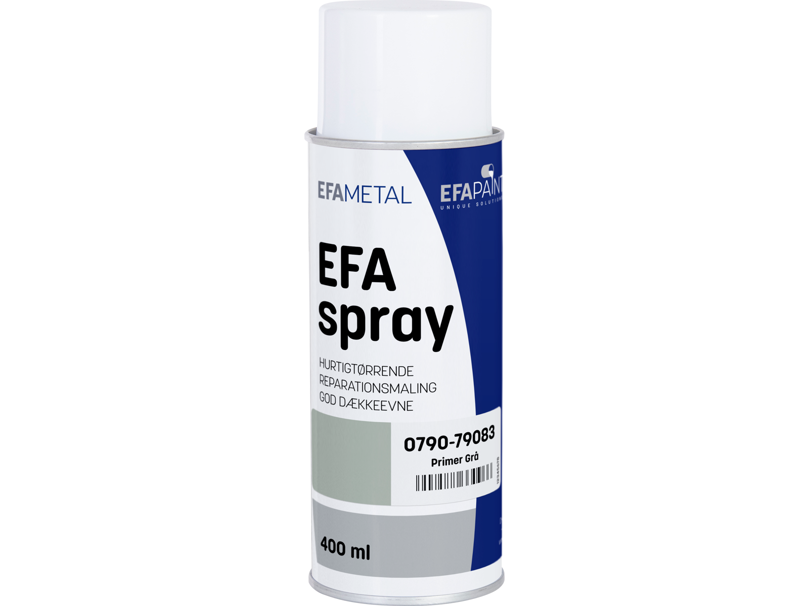 Reparationsmaling til overfladebehandling af stål efter grunding. Spraymaling på basis af alkyd og med propan/butan som drivmiddel. Efaspray er hurtigtørrende og velegnetåtil reparation af mindre områder. Fås i flere farver.