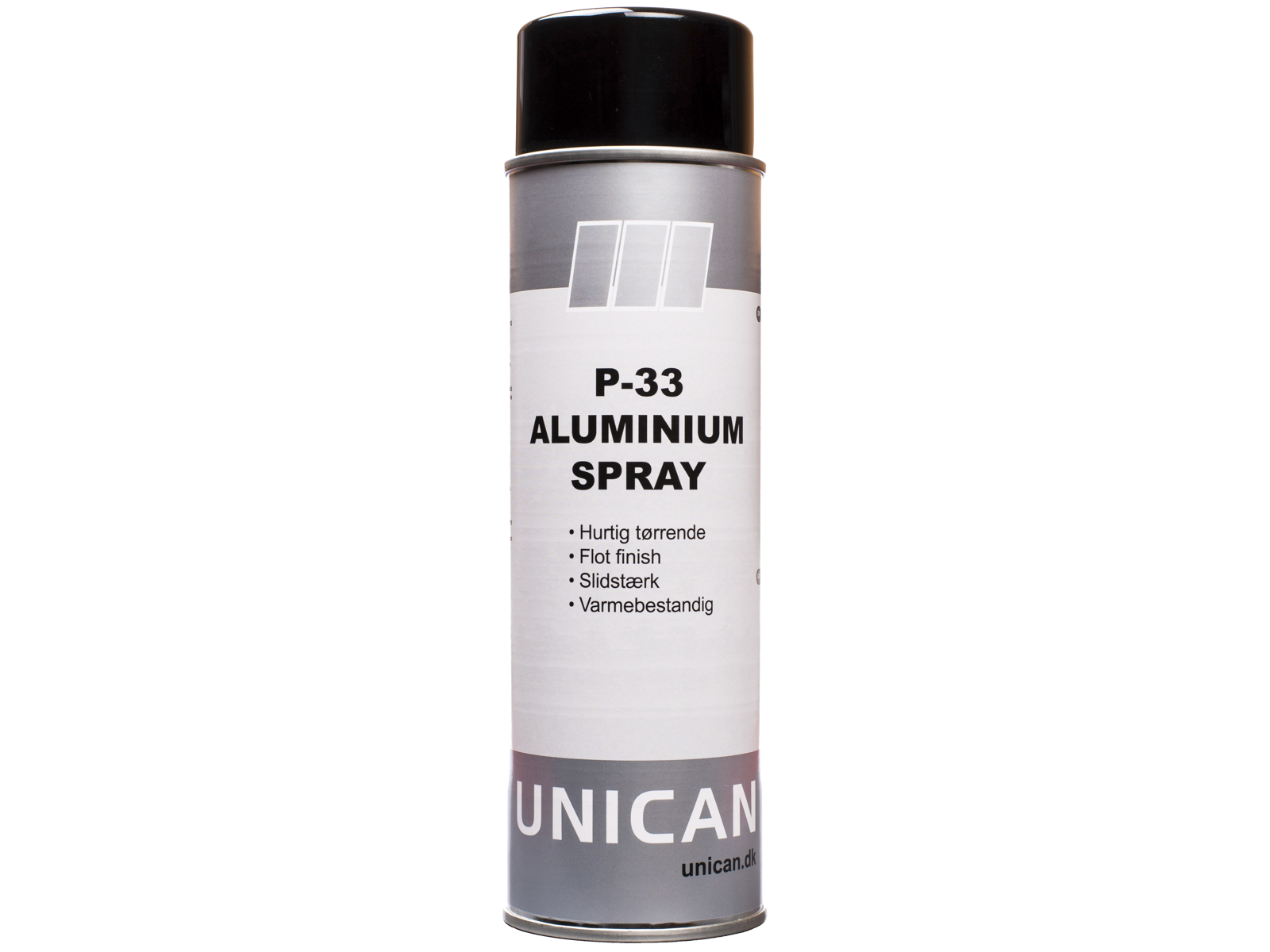 P-33 Aluminiumsspray anvendes til en lang række forskellige reparations og vedligeholdelses-opgaver indenfor industrien. Produktet efterlader den påførte overflade med en flot og yderst slidstærk finish. P-33 Aluminium spray har en fremragende dækkeevne og hæfter på en lang række overflader såsom værktøj, fælge, metaloverflader m.m. Unican P-33 Aluminium spray kan med fordel anvendes sammen med Unican P-55 Lys Primer, P-66 Rødbrun Primer eller P-88 Zinkspray for en yderst kraftig rustbeskyttelse. Produktet påføres på en ren tør overflade, afrens eventuelt emnet med Unican C-1000 Power Cleaner. Påfør produktet i en afstand af 25-30 cm, rengør dysen efter endt brug ved at vende dåsen på hovedet og aktiver dysen i nogle sekunder.