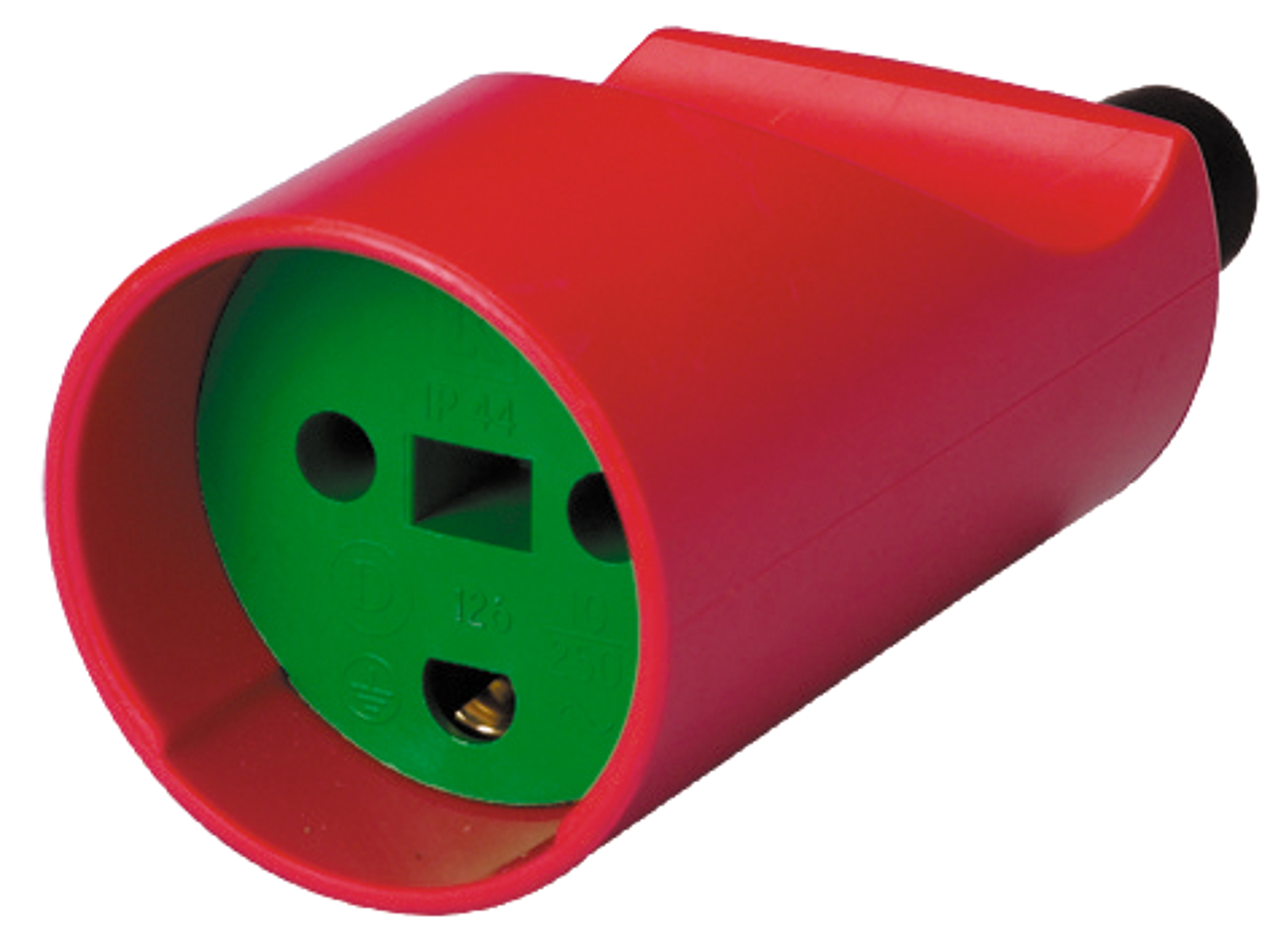 Rød/grøn rund stikprop, eller rød/grøn forlængerled. Begge med jord, og i ekstra forstærket plast. 230 V, 16 A. IP44.