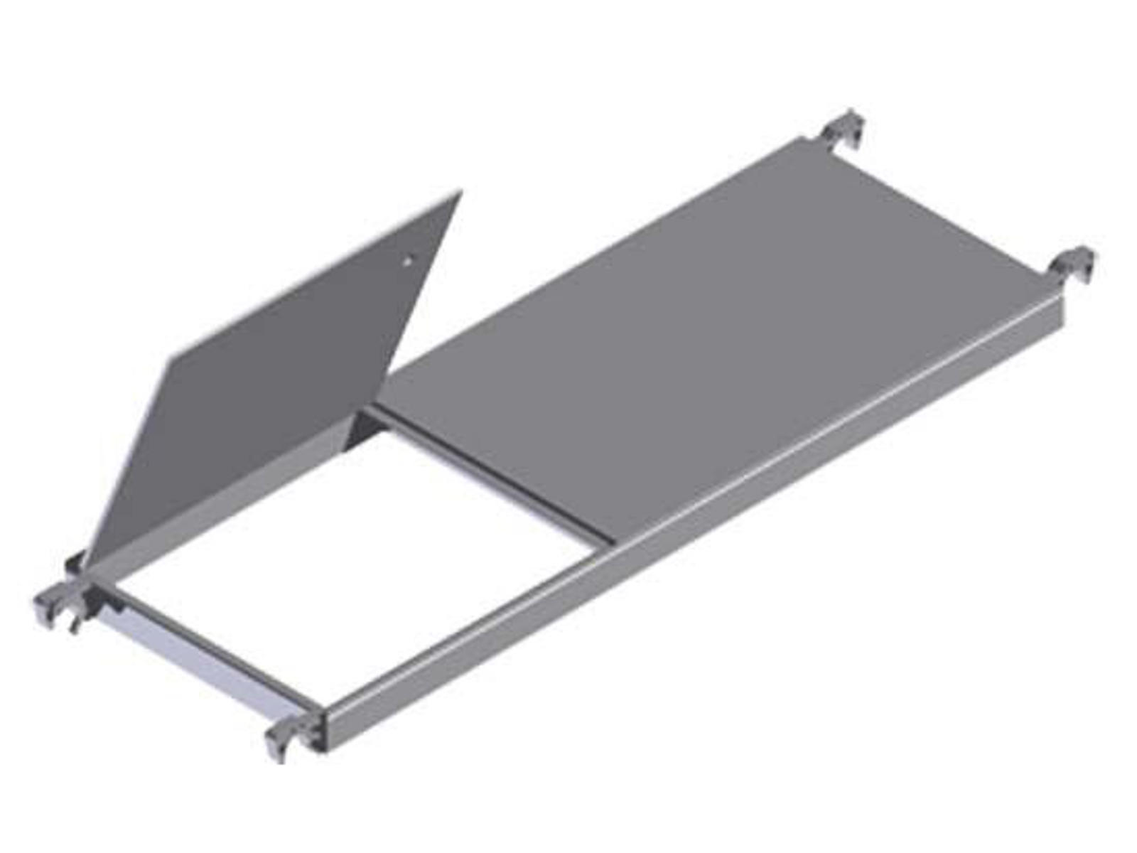 Platform med halv lem, til stillads. Med låsemekanisme for stabilitet på mellem- og arbejdsplatform. Af stabil aluminiumramme svejset hele vejen rundt med vandfast, 7-lags limet krydsfinerplade, med skridhæmmende overflade og 4 selvlåsende kløer (grå) af trykstøbt aluminium. B: 600 mm. Fås i flere varianter.