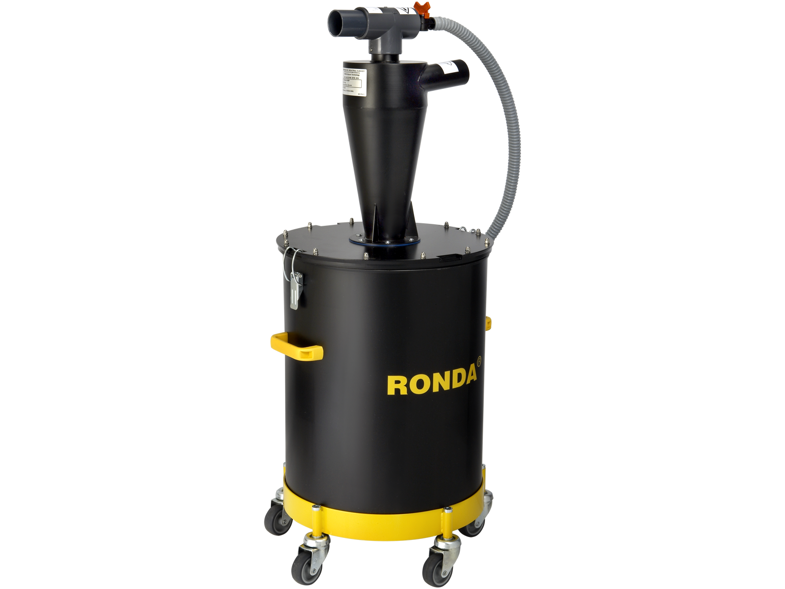 Cyklonforudskiller sættes foran en støvsuger eller en anden form for sugeenhed i tilfælde, hvor man suger meget fint støv og derfor ønsker at beskytte støvsugerens filtersystem, eller i tilfælde, hvor man har behov for ekstra beholderkapacitet. RONDA CF-502P er standard udgaven med plastbeholder. RONDA CF-502 udskiller op til 98-99% af det opsugede materiale og kun ganske lidt af støvet havner i selve sugeenheden, hvilket øger støvsugerfilterets levetid betragteligt. Med en opsamlingskapacitet på 50 liter giver den mobile forudskiller mulighed for opsamling af større mængder materiale, samtidig med at arbejdsradiussen øges. Kan anvendes til opsamling af både fugtigt og tørt materiale. Materialet opsamles enten direkte i beholderen, eller i en kraftig plastsæk, som efterfølgende forsegles med tilhørende lukkestrip. Dette sikrer en nem og forsvarlig transport af det opsamlede materiale. Opsamling med/uden plastsæk. Udskiller med cykloneffekt. Mindre filterbelastning på sugeenhed. Nem tøm