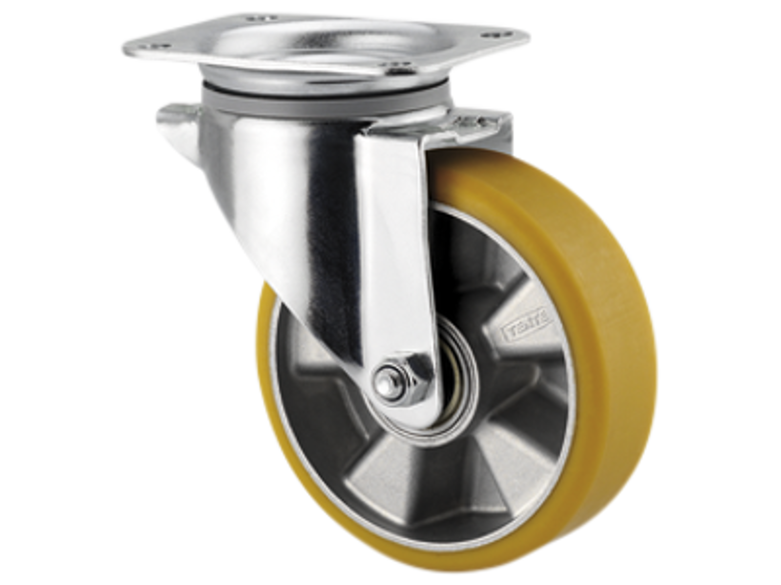 Drejeligt dobbelthjul med gaffel i svær stålplade med bred gaffelform og dobbelt kuglekrans. Nav i aluminium med polyuretanbane samt DIN-kugleleje. Med plade. Fås i flere dimensioner.