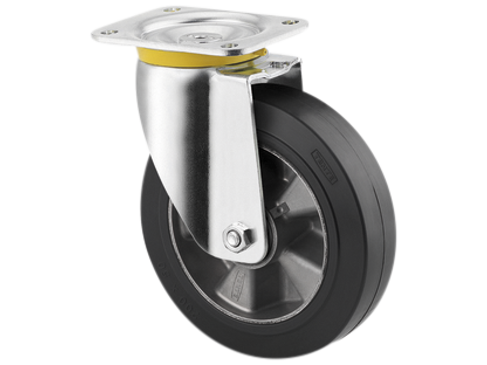 Drejeligt hjul til sværlast. Med dobbelt kuglekrans, nittet. Nav i aluminium med sort gummibane. DIN-kugleleje. Med pladebefæstigelse. Fås i flere dimensioner.