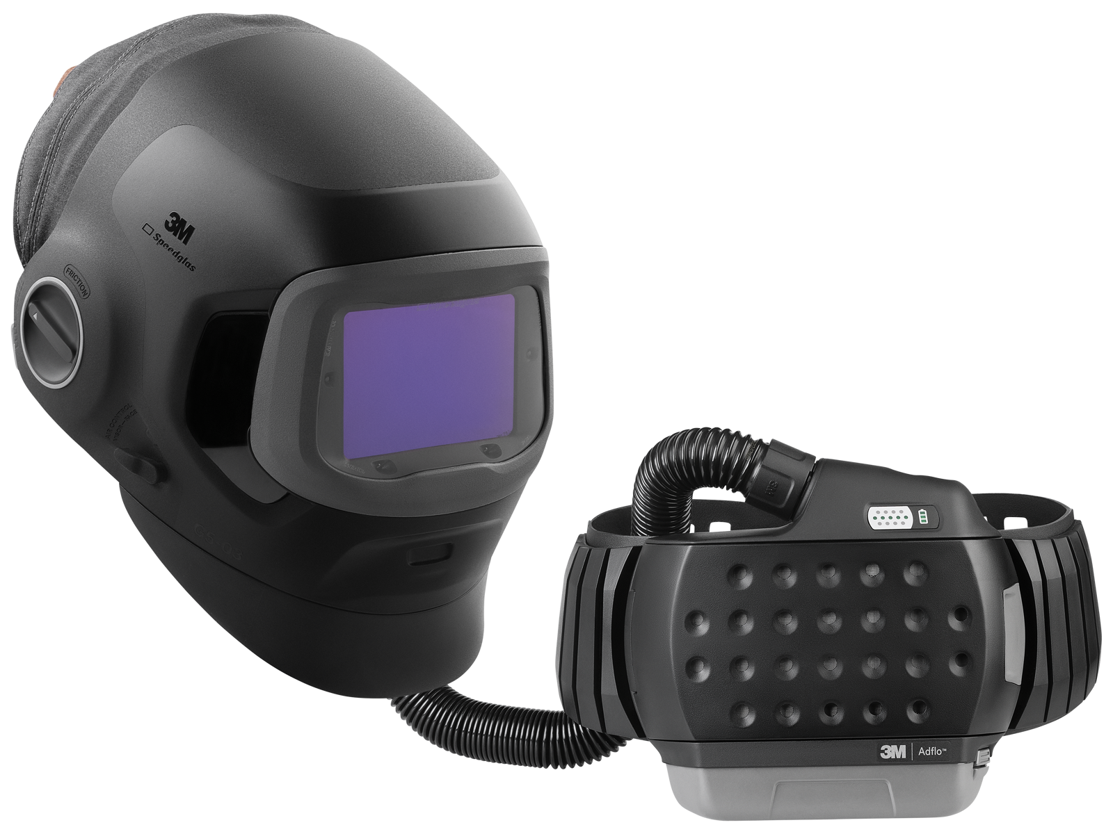 Svejseskærm G5-03 Pro med svejsekassette TW og Adflo turbo-åndedrætsværn til svejsere, der arbejder i forskellige svejsemiljøer. Svejsefilter 109×73 mm med naturlig farveteknologi. Mørk tilstand 8-13. Lystilstand DIN 2,5. Skiftetid lys-mørk 0,1 msek. Forsinkelsesfunktion fra mørk-lys, 50-1.300 msek. Fire lysbue-detektionssensorer. TAP-funktion. Bluetooth-forbindelse. Batterilevetid 1.500-2.000 timer. Auto-ON. ISO V2 klassificering. Skærmen giver mulighed for at skifte mellem svejse- og slibningsopgaver samtidig med at den opretholder åndedrætsbeskyttelse gennem Tap-funktionen.
