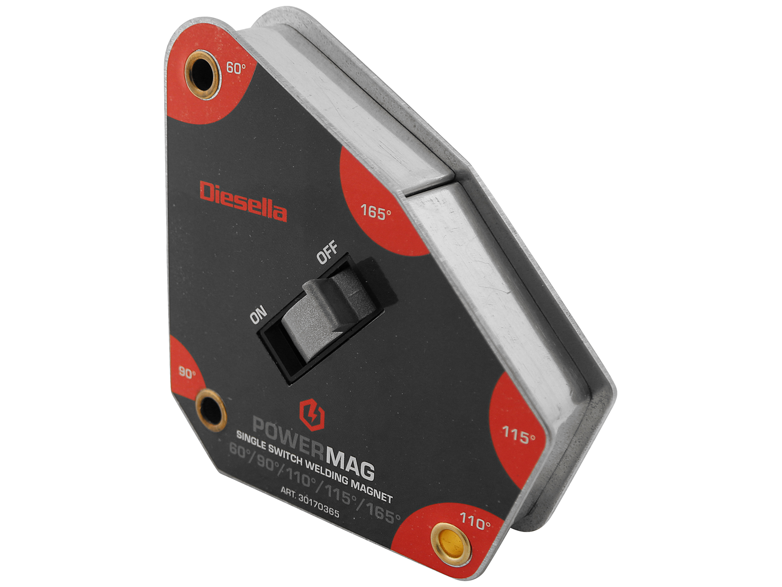 Powermag svejsemagnet med on/off funktion. Kan holde op til 30kg / 295 Nm. Til 60°/90°/110°/115°/165° vinkler. Måler 105×29×110 mm.