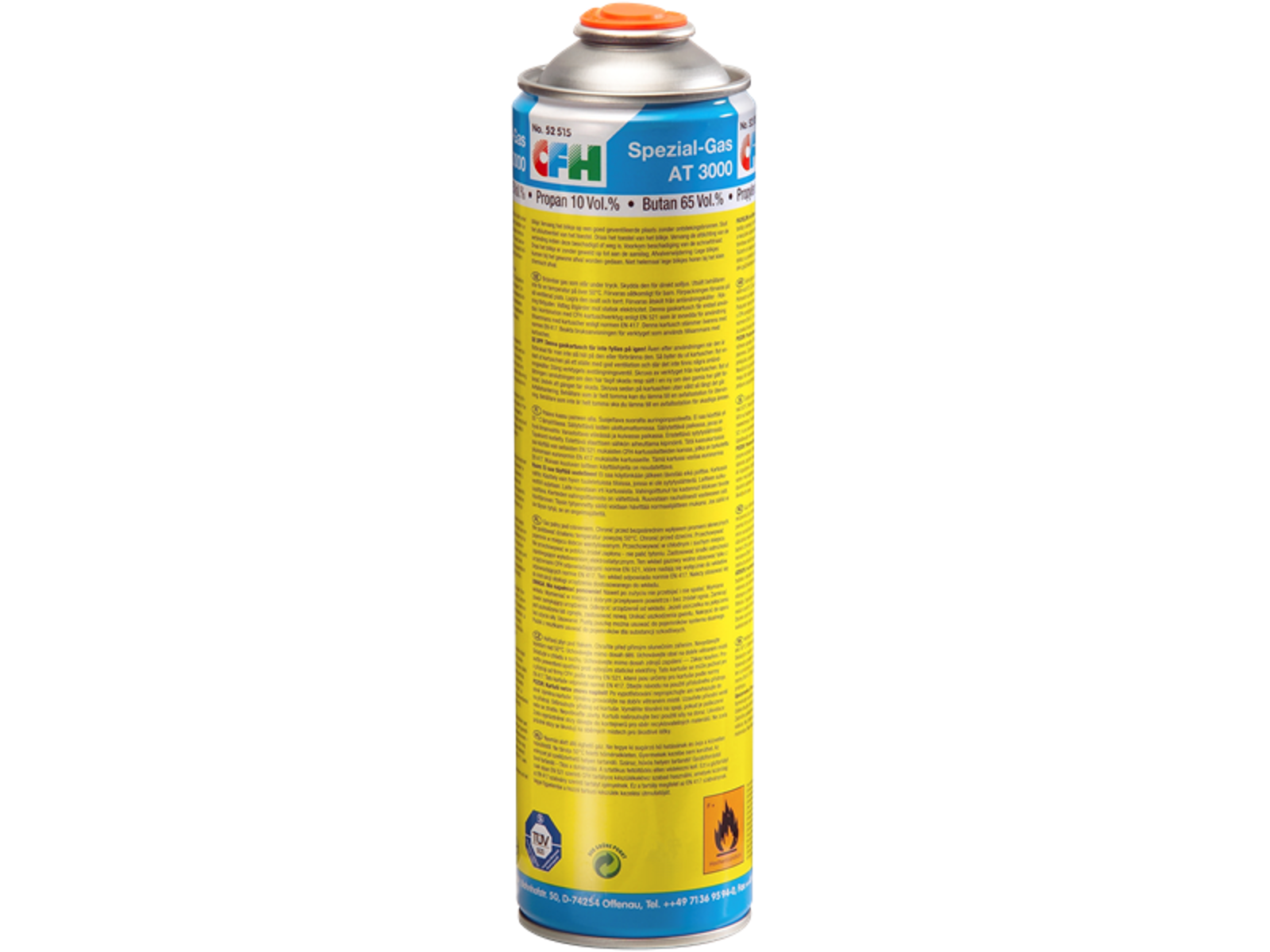 Højeffektblandingsgas. Butan 65 Vol. %, propylen 25 Vol. %, propan 10 Vol. %. Indhold 600 ml, 330 gram.