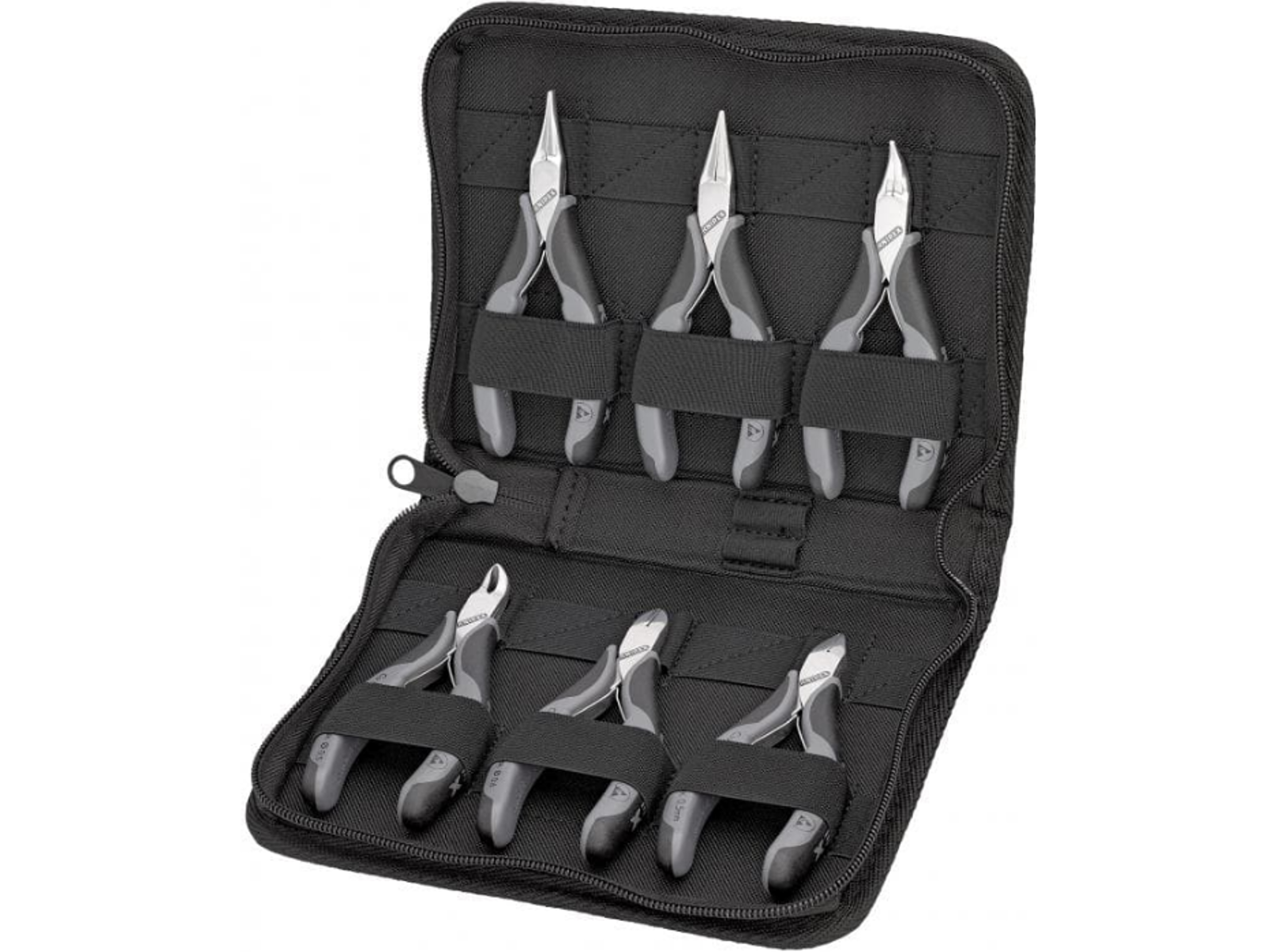 Sæt med 6 stk. ESD elektronik-tænger. Leveres i praktisk pung med elastikker til fastholdelse af tænger og lynlås. Indhold: ESD elektronik-bidetang, ESD elektronik-gribetang, ESD elektronik-gribetag 45°, ESD elektronik-endebidetang, ESD elektronik-skævbider og ESD elektronik-skævbider.