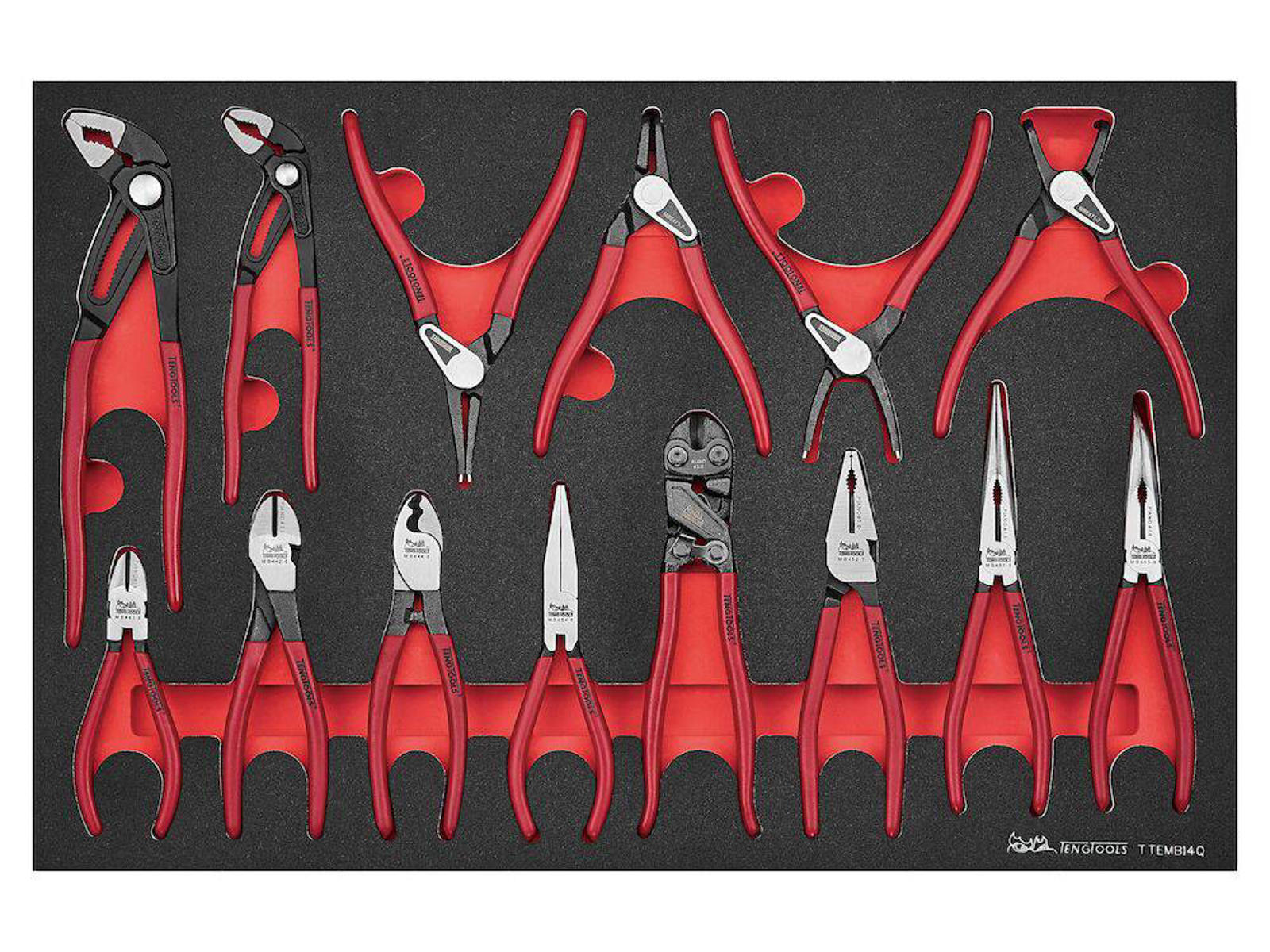 Alle de mest almindeligt benyttede tænger i ét sæt. Vinylgreb med slankt design, der sikrer bedre adgang på steder, hvor pladsen er trang. Låseringstang med usynlig returfjeder med henblik på nemmere betjening. Vandpumpetang med hurtigindstilling. Værktøjet holdes på plads ved hjælp af trefarvet, forskåret skum, der tydeligt viser, hvor de enkelte værktøjsdele hører til. Udviklet, så det passer perfekt i den store skuffe i TengTools’ værktøjskasser. Kan bruges som et sæt alene eller som en del af TengTools’ “Get organised”-system.