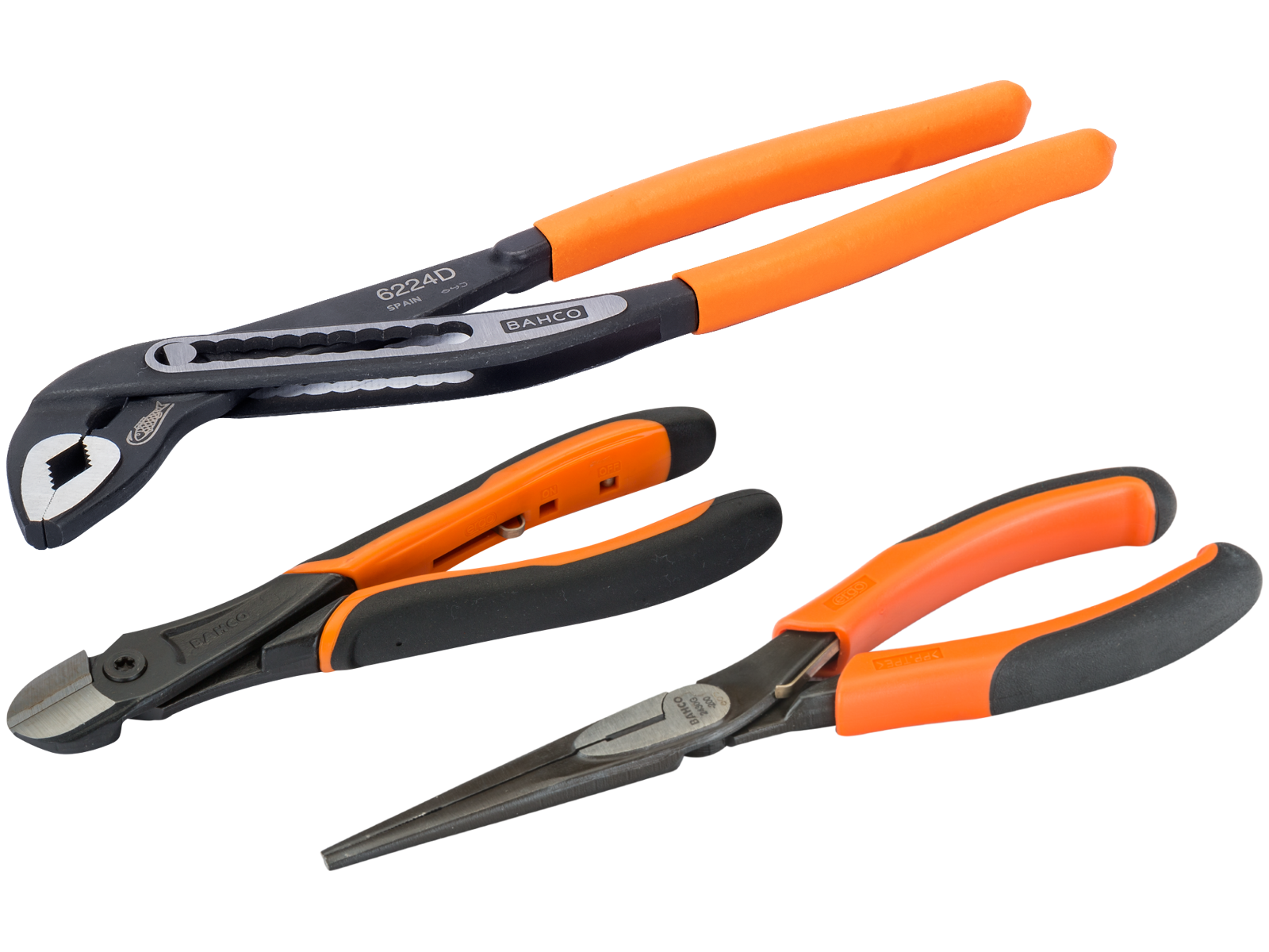 Sæt med 3 tænger, alle udført i højtlegeret stål. Indeholder 250 mm vandpumpetang (lev. varenr 6224DIP), 200 mm spidstang (lev. varenr 2430G-200IP) og 160 mm HD sidebidetang (lev. varenr 21HDG-160IPC).