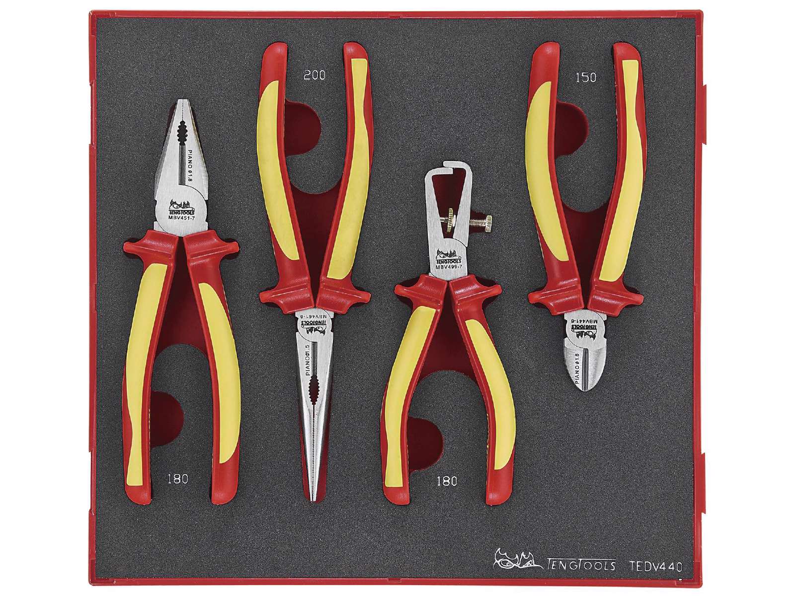 Leveres i indbygningsboks af plast med aftageligt låg. Tængerne ligger i EVA-skum i tre forskelligt farvede lag. Boksene passer i Teng Tools’ værktøjskasser og vogne.