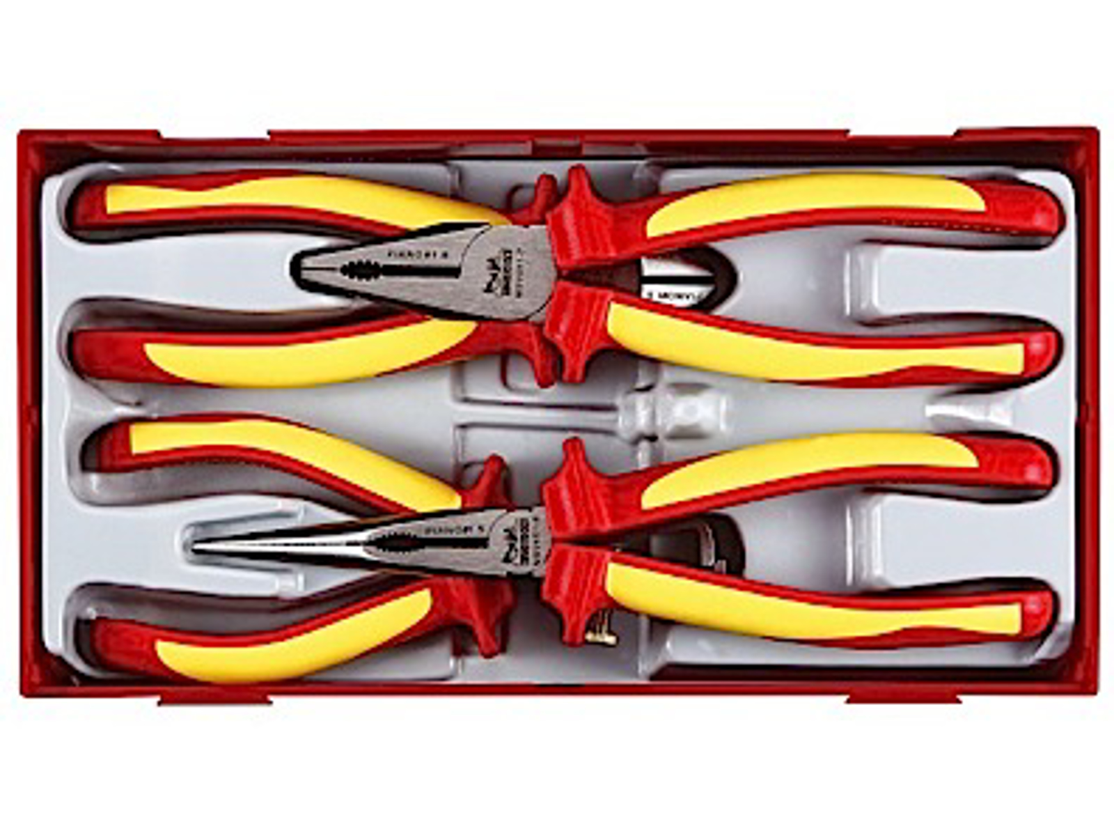 Sæt med 4 isolerede tænger. Fremstillet i henhold til standard IEC 60900 vedr. arbejde under spænding op til 1.000 V vekselstrøm (af specialuddannet personale).