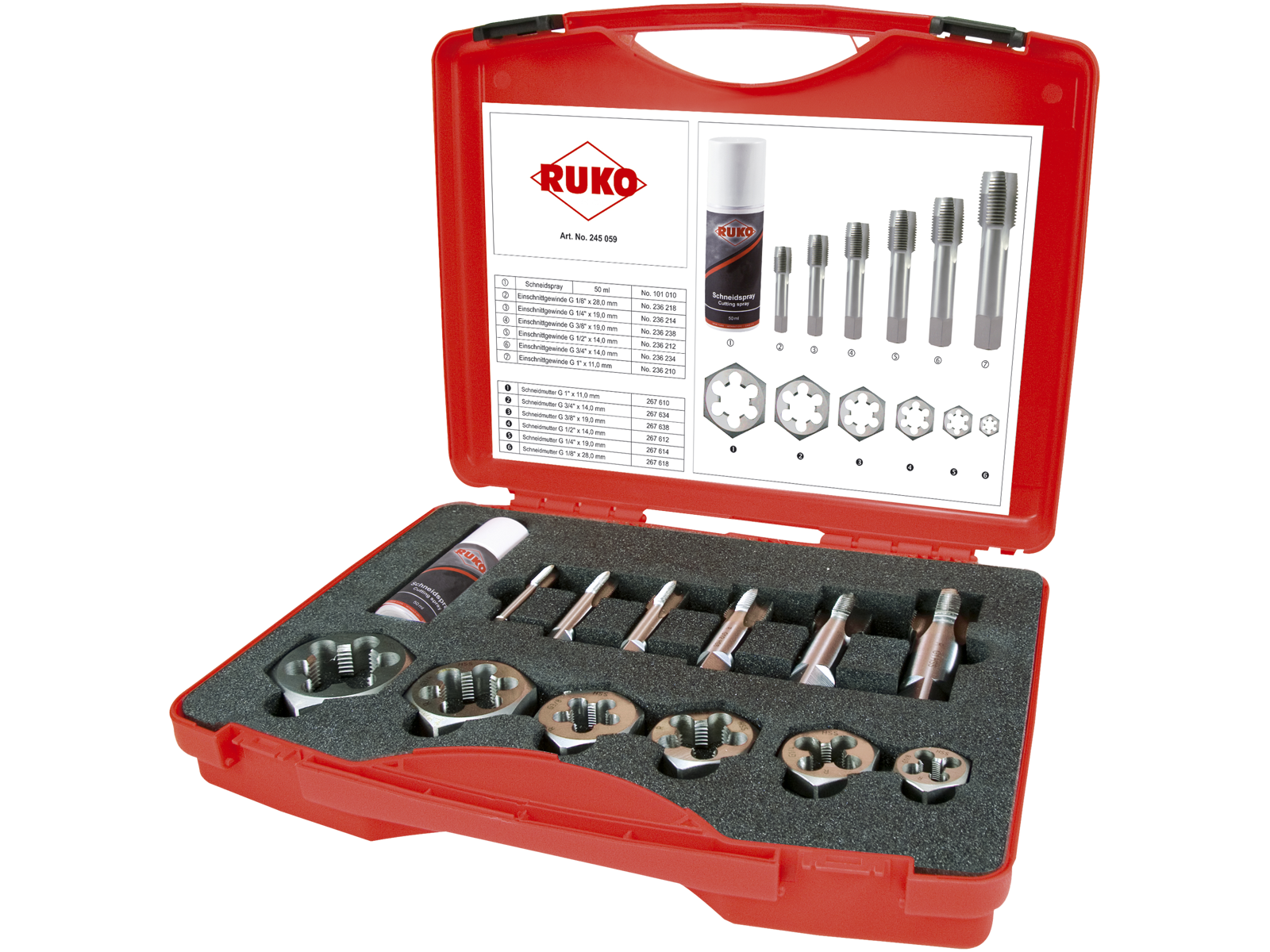 Ruko gevindværktøjssæt i kunststofkuffert (VVS rørgevind). Indeholder mellem tap HSS G 1/8×28 / G 1/4×19 / G 3/8×19 / G 1/2×14 / G 3/4×14 / G 1"×11. Skæremøtrik HSS G 1/8×28 / G 1/4×19 / G 3/8×19 / G 1/2×14 / G 3/4×14 / G 1"×11. 1 stk skærespray 50 ml.