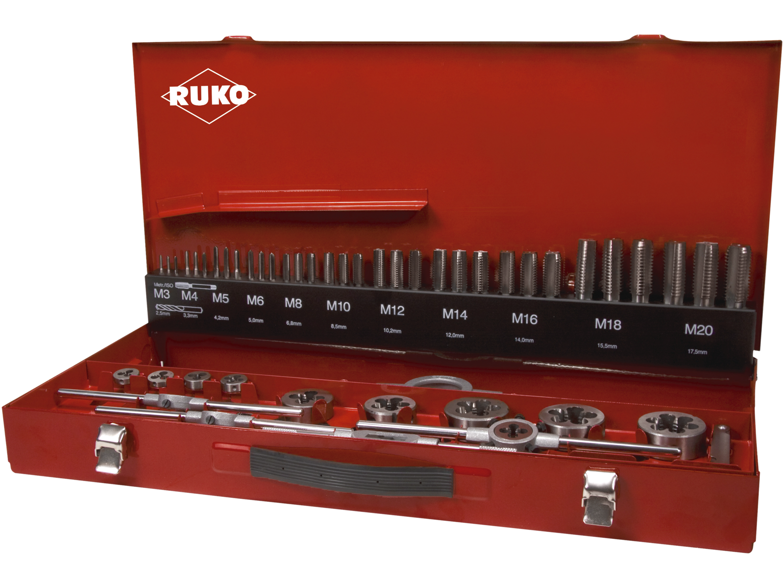 54 dele med gevindværktøj-sæt. Med 3 håndsnittappe DIN352 M3, M4, M5, M6, M8, M10, M12, M14, M16, M18, M20 + 11×snitbakke DIN EN 22568 M3, M4, M5, M6, M8, M10, M12, M14, M16, M18, M20 + 6×snitbakke-holder DIN225 20×5 / 20×7 / 25×9 / 30×11 / 38×14 / 45×18 mm + 2×vindejern DIN1814 str. 1 + str. 3 + 1×skruetrækker + 1×gevindskabelon.