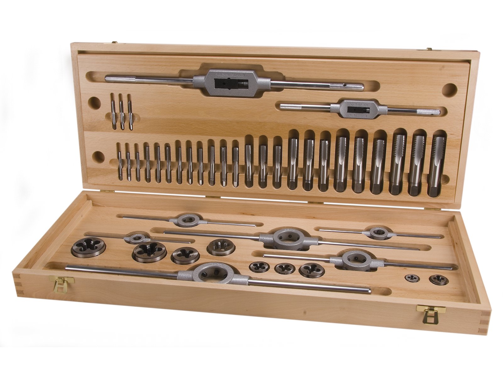 Ruko gevindværktøjssæt i trækasse med UNC gevind 1/4 til 1" Indeholder sæt med 3 håndtappe UNC 1/4×20 / 5/16×18 / 3/8×16 / 7/16×14 / 1/2×13 / 5/8×11 / 3/4×10 / 7/8×9 / 1"×8 . Rund bakke UNC 1/4×20 / 5/16×18 / 3/8×16 / 7/16×14 / 1/2×13 / 5/8×11 / 3/4×10 / 7/8×9 / 1"×8. Vindejern nr. 2 + 4. Ø-klup 20×7 mm / 25×9 mm / 30×11 mm / 38×10 mm / 45×18 mm / 55×22 mm.