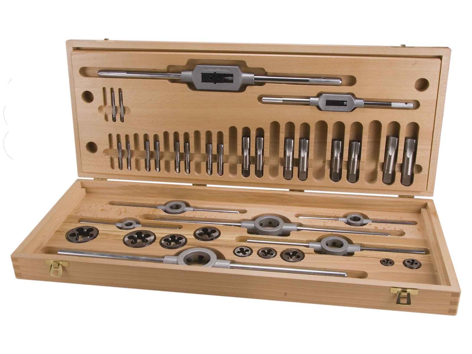Ruko gevindværktøjssæt i trækasse med UNF gevind 1/4 til 1". Indeholder sæt med 2 håndtappe UNF 1/4×28 / 5/16×24 / 3/8×24 / 7/16×20 / 1/2×20 / 5/8×18 / 3/4×16 / 7/8×14 / 1"×12 . Rund bakke UNF 1/4×28 / 5/16×24 / 3/8×24 / 7/16×20 / 1/2×20 / 5/8×18 / 3/4×16 / 7/8×14 / 1"×12. Vindejern nr. 2 + 4. Ø-klup 20×7 mm / 25×9 mm / 30×11 mm / 38×10 mm / 45×14 mm / 55×16 mm.