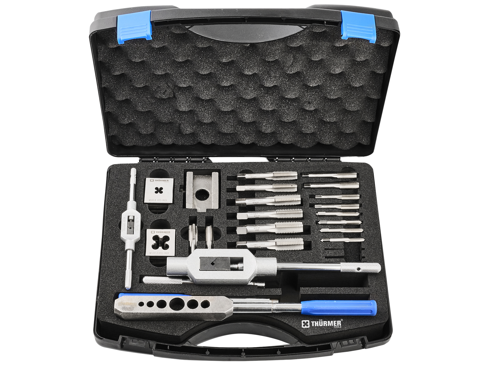 Gevindskæresæt M5-M16 & MF12. Et omfattende sæt designet til at skabe præcise indvendige og udvendige gevind i en række størrelser fra M5 til M16. Fremstillet af højhastighedsstål (HSS). Sættet inkluderer håndtappe, firkant bakker og matchende holdeværktøj for sikker og effektiv drift. Leveres i kuffert.