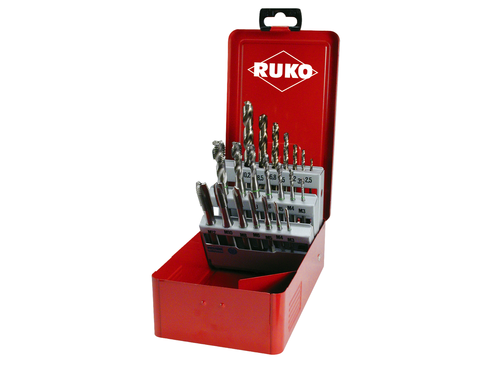 21 dele maskinsnittap-sæt. 7 maskinsnittappe DIN371/376, form B med spånbryder: M3, M4, M5, M6, M8, M10, M12 samt 7 stk maskinsnittappe DIN371/376, form C 35°. RSP: M3, M4, M5, M6, M8, M10, M12 samt 7 spiralbor DIN338 Type N: Ø2,5 / 3,3 / 4,2 / 5,0 / 6,8 / 8,5 / 10,2 mm.
