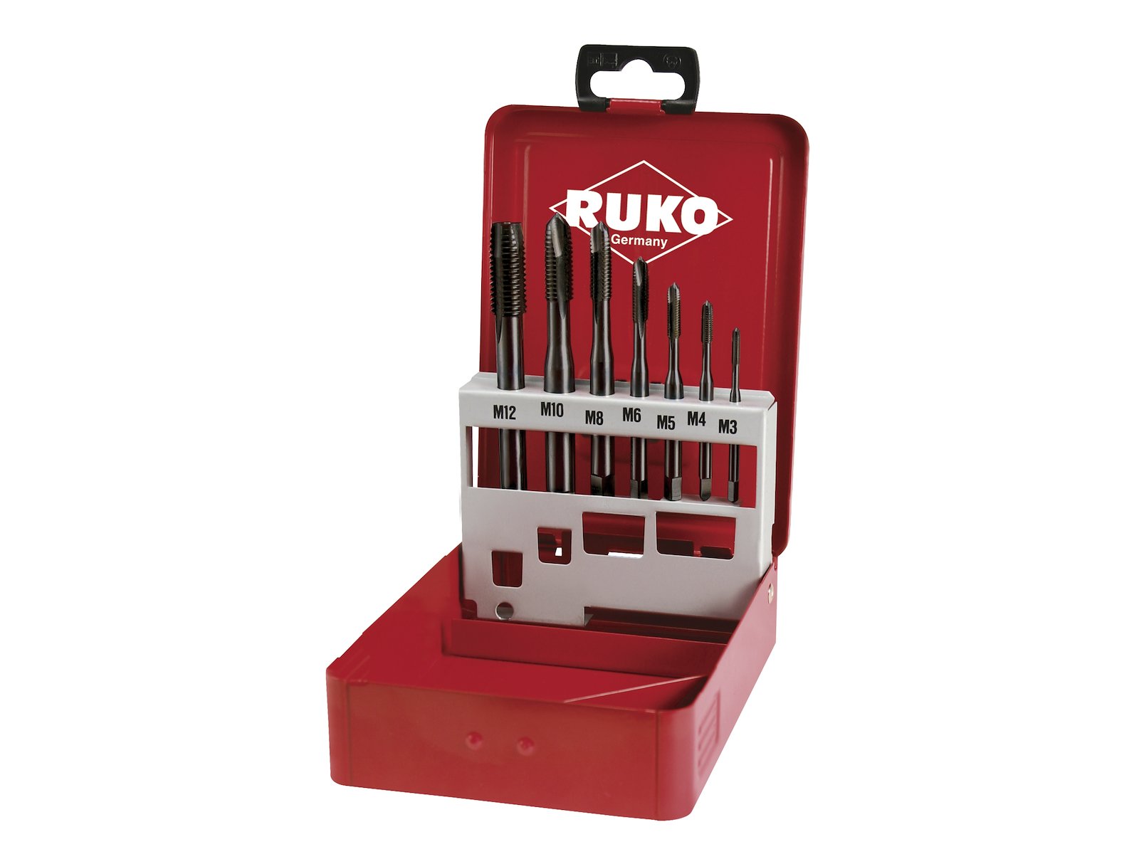 Sæt med 7 spånbrydertappe HSS M3, M4, M5, M6, M8, M10, M12 mm i stålkassette. Maskinsnittappe af højpræstations-hurtigstål. Til gennemgangsgevind i ulegeret stål op til 800 N/mm² styrke. Gevindet bliver skåret i en arbejdsgang.