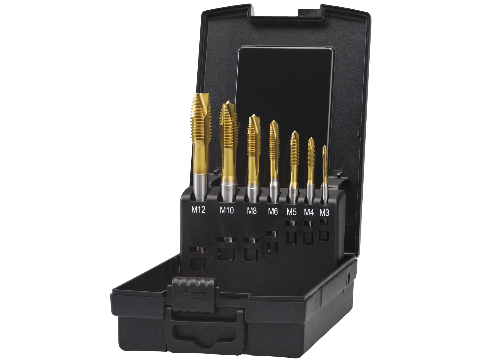 Maskintapsæt med 7 dele. Universal-tappe til de mest gængse materialer. Speciel geometri forhindrer overskæring. Pistolnæse til gennemgående huller og spiral til blindhuller. TiN-belagt version for ekstra god værktøjslevetid og højere skærehastighed. DIN 371/376. Indhold: M3, M4, M5, M6, M8, M10 og M12. Leveret i opbevaringsboks.