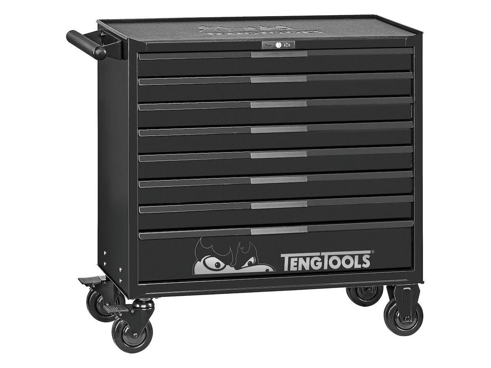 Værktøjsvognen TengTools TSW37R7/TSW37B8 er 37'' brede værktøjsvogne, som findes i konfiguration med syv eller otte skuffer. 3-trinskuglelejeskinner med måtter af EVA-skum – praktisk og støjsvag åbning og lukning af skufferne. Skelet af stål af høj kvalitet (tre dele). Behandlet med fosfatfri rustbeskyttelse (5-trinsbehandling) og pulverlakeret overflade for optimal korrosionsbestandighed. Robust styrehjul og håndtag med behageligt greb, der gør vognen behagelig at bruge og giver en god stabilitet. Kompatibel med TengTools modulopbyggede værktøjsløsning.