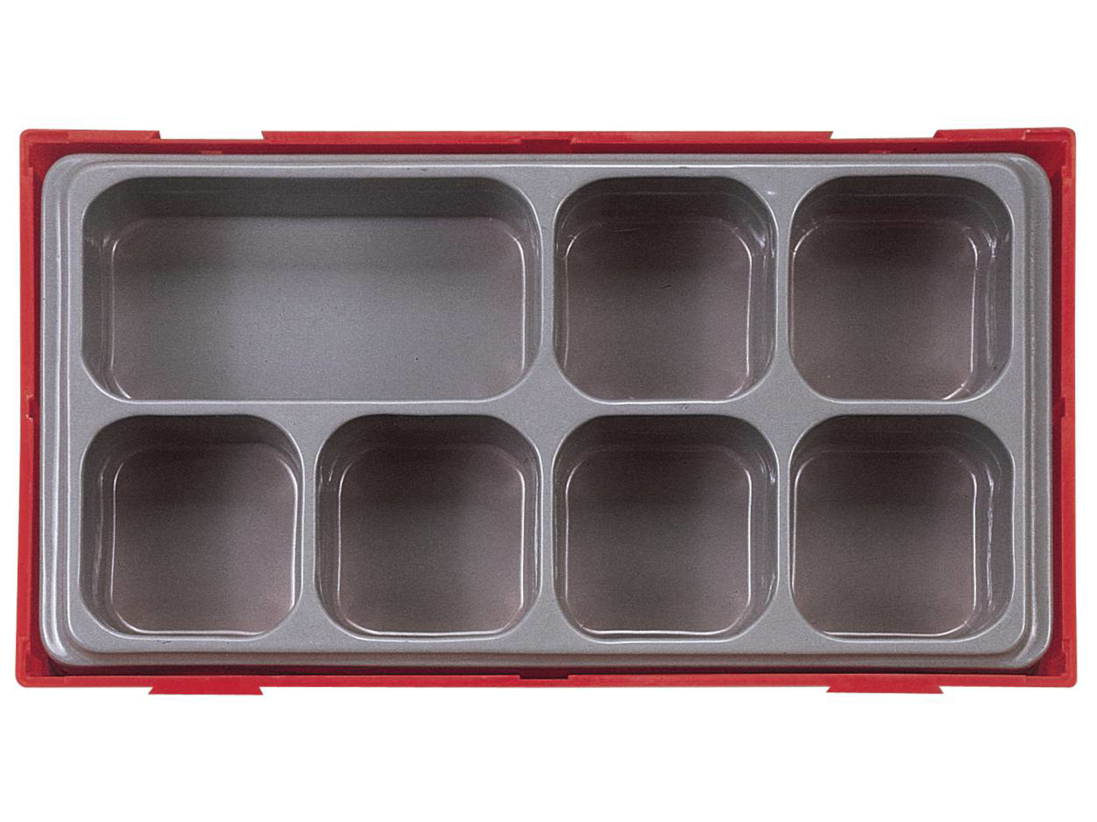 Indbygningskasse med ruminddeling. Af plast med aftageligt låg. Flere kasser kan sammenbygges. Passer i Teng Tools værktøjskasser og montørvogne.