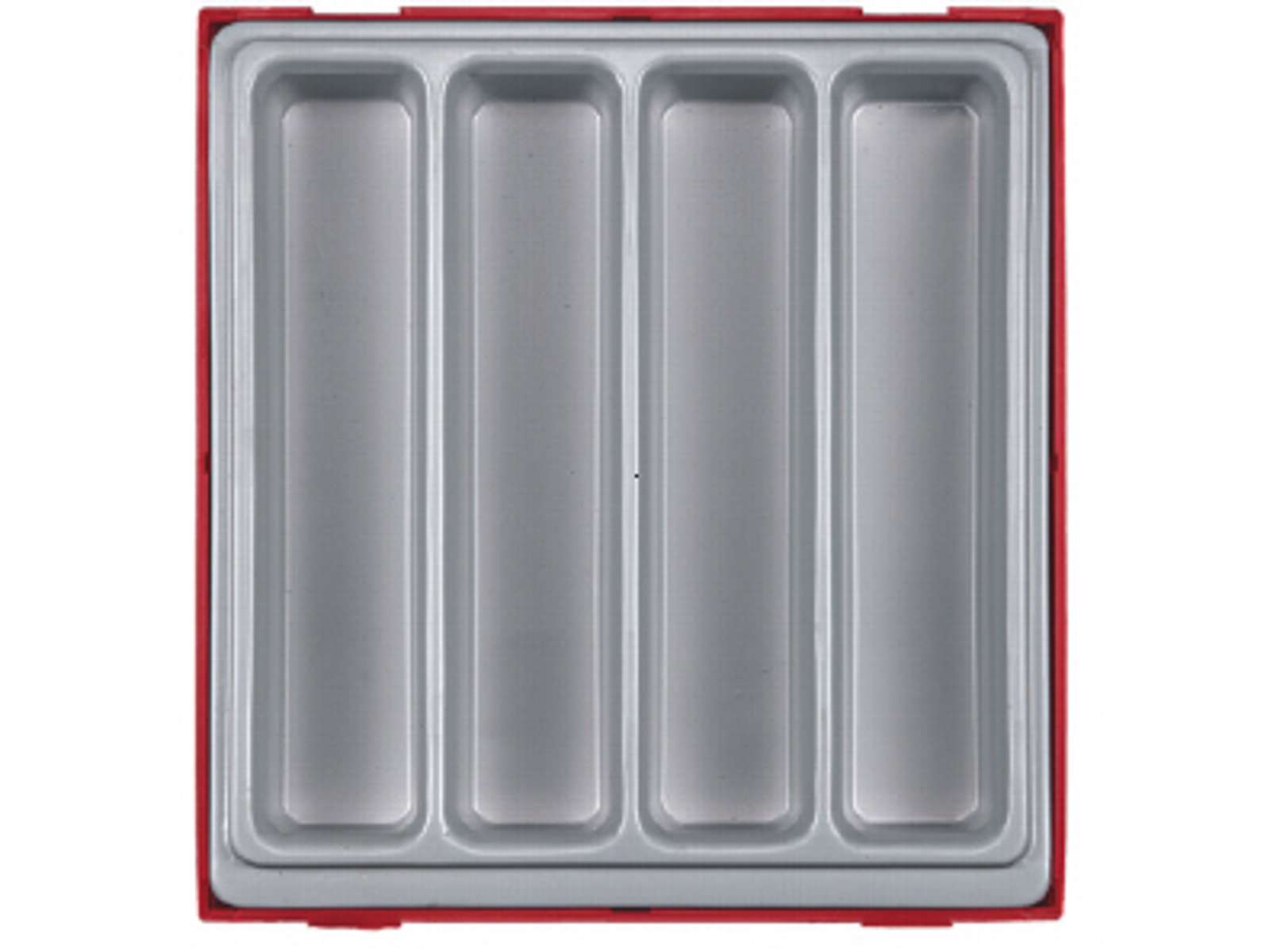 Indbygningsbokse af plast med 4 ruminddelinger. Med aftageligt låg. Flere bokse kan sammenbygges.