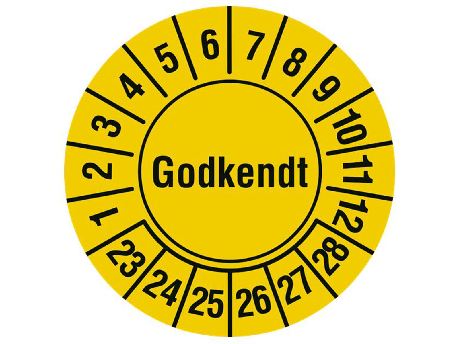 Runde kalibreringsmærker lavet på selvklæbende etiketter, med teksten Godkendt. Etiketterne leveres med sort tekst på gul baggrund og bliver opsat på ark a 10 stk.
