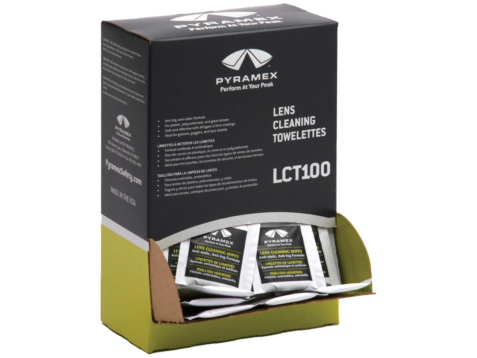 100 stk. individuelt pakkede Pyramex renseservietter til briller, googles og ansigtsskærme af plastik, glas og polycarbonat.