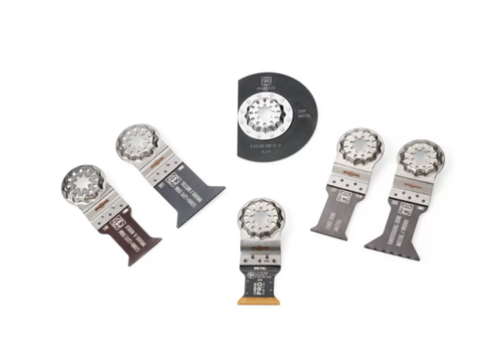 Multicutterklingesortiment "Best of Starlock metal". Indeholder 6 savklinger specielt til bearbejdning af hærdede og ikke-hærdede metaller. Indhold: 1 E-Cut CarbidePRO-savklinge (40×32 mm), 1 af hver E-Cut Longlife savklinger (50×35 mm og 50×50 mm), 1 E-Cut universal-savklinge (55×44 mm), 1 E-Cut Fine-savklinge (50×30 mm), samt 1 fuld HSS segmentsavklinge (ø85 mm). Passer til alle Fein multitools samt alle andre gængse multitools med Starlock-holder.